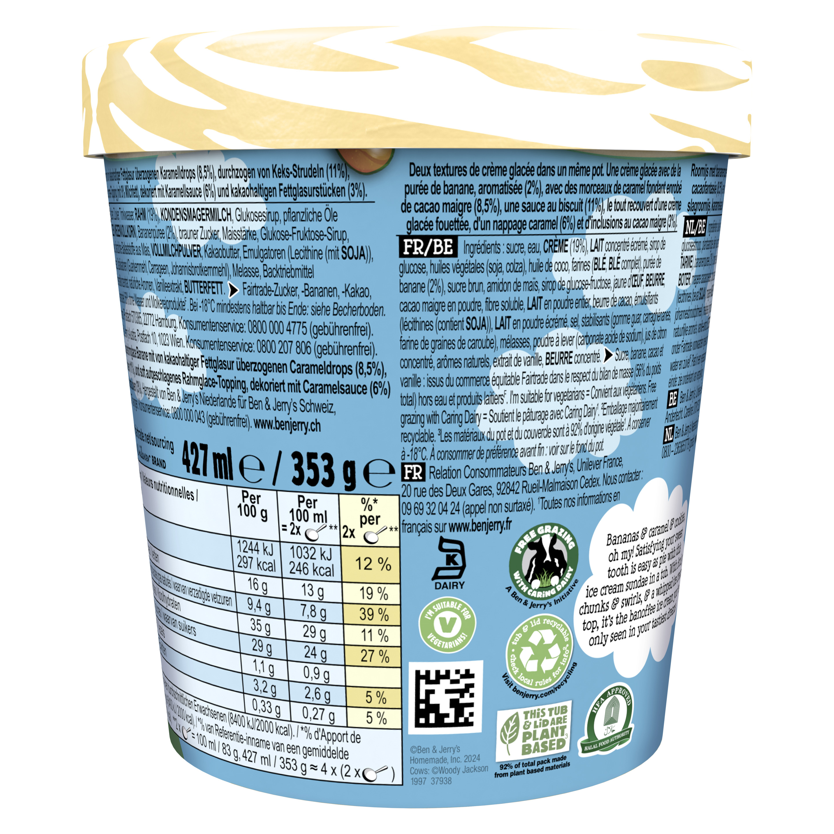 Ben & Jerry's Sundae Oh My Banoffee Pie, das sind Bananen, Karamell und Keks-Strudel, yummy Mit dieser Eiskreation ist es ein Kinderspiel, die innere Naschkatze zu begeistern. Extra mit leckeren Stücken und Strudeln unter einer fluffigen Eiscreme-Topping ist ein bananiger Eiscremetraum.