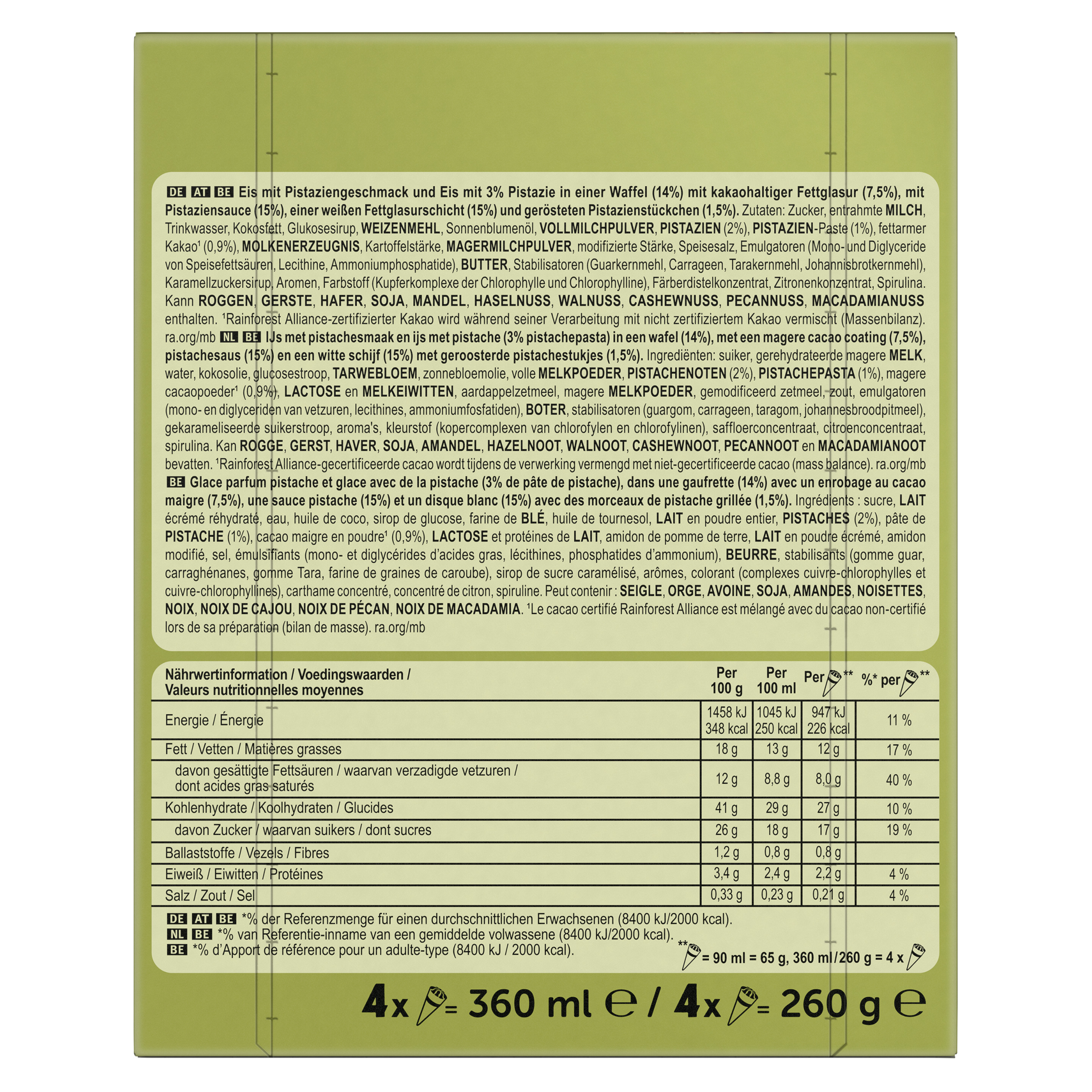 Zutaten: Zucker, entrahmte MILCH, Trinkwasser, Kokosfett, Glukosesirup, WEIZENMEHL, Sonnenblumenöl, VOLLMILCHPULVER, PISTAZIEN (2%), PISTAZIEN-Paste (1%), fettarmer Kakao¹ (0,9%), MOLKENERZEUGNIS, Kartoffelstärke, MAGERMILCHPULVER, modifizierte Stärke, Speisesalz, Emulgatoren (Mono- und Diglyceride von Speisefettsäuren, Lecithine, Ammoniumphosphatide), BUTTER, Stabilisatoren (Guarkernmehl, Carrageen, Tarakernmehl, Johannisbrotkernmehl), Karamellzuckersirup, Aromen, Farbstoff (Kupferkomplexe der Chlorophylle und Chlorophylline), Färberdistelkonzentrat, Zitronenkonzentrat, Spirulina. Kann ROGGEN, GERSTE, HAFER, SOJA, MANDEL, HASELNUSS, WALNUSS, CASHEWNUSS, PECANNUSS, MACADAMIANUSS enthalten. ¹Rainforest Alliance-zertifizierter Kakao wird während seiner Verarbeitung mit nicht zertifiziertem Kakao vermischt (Massenbilanz).