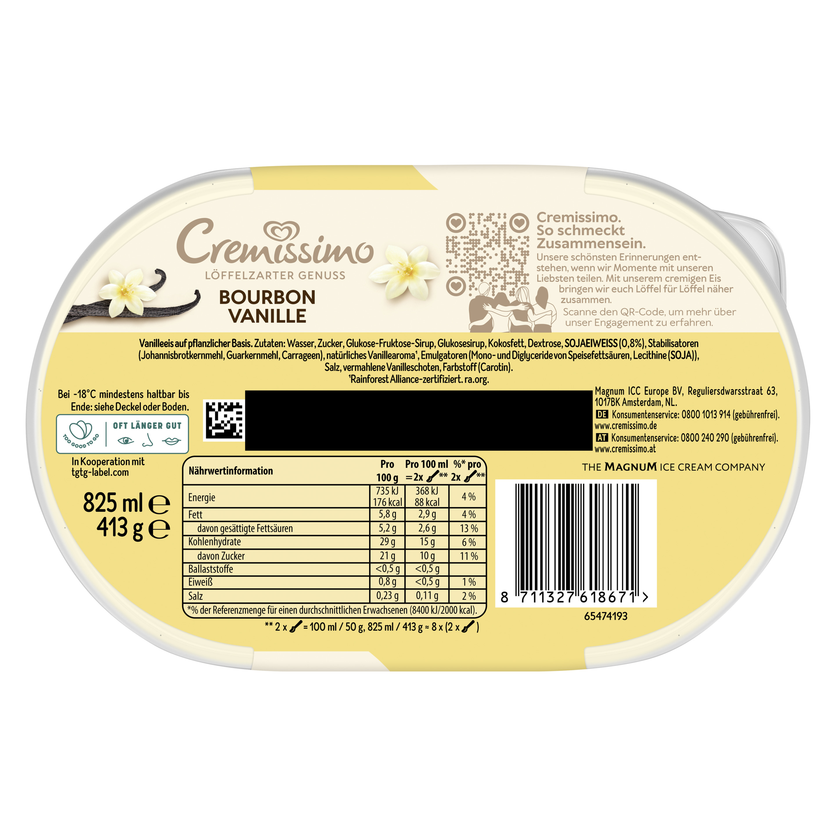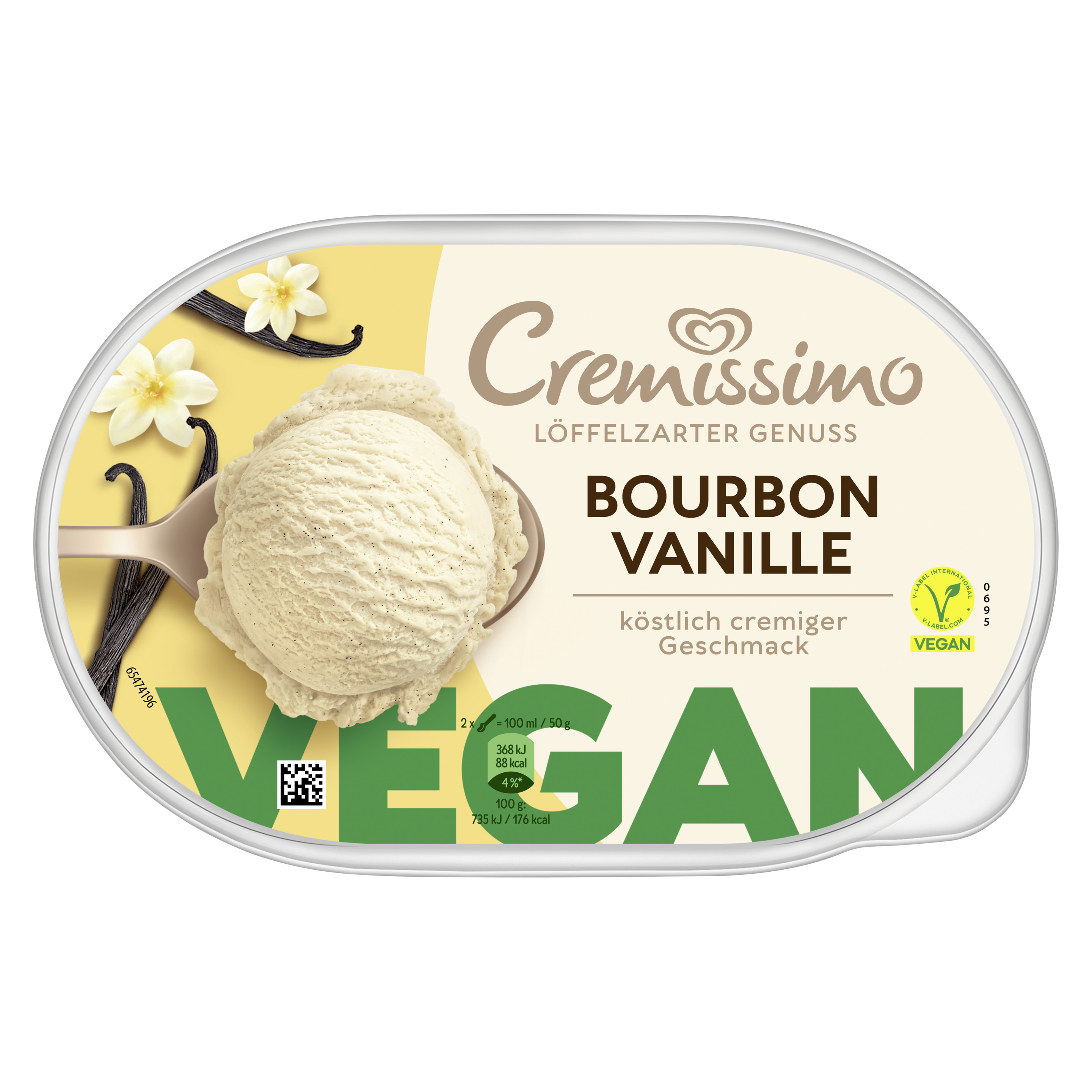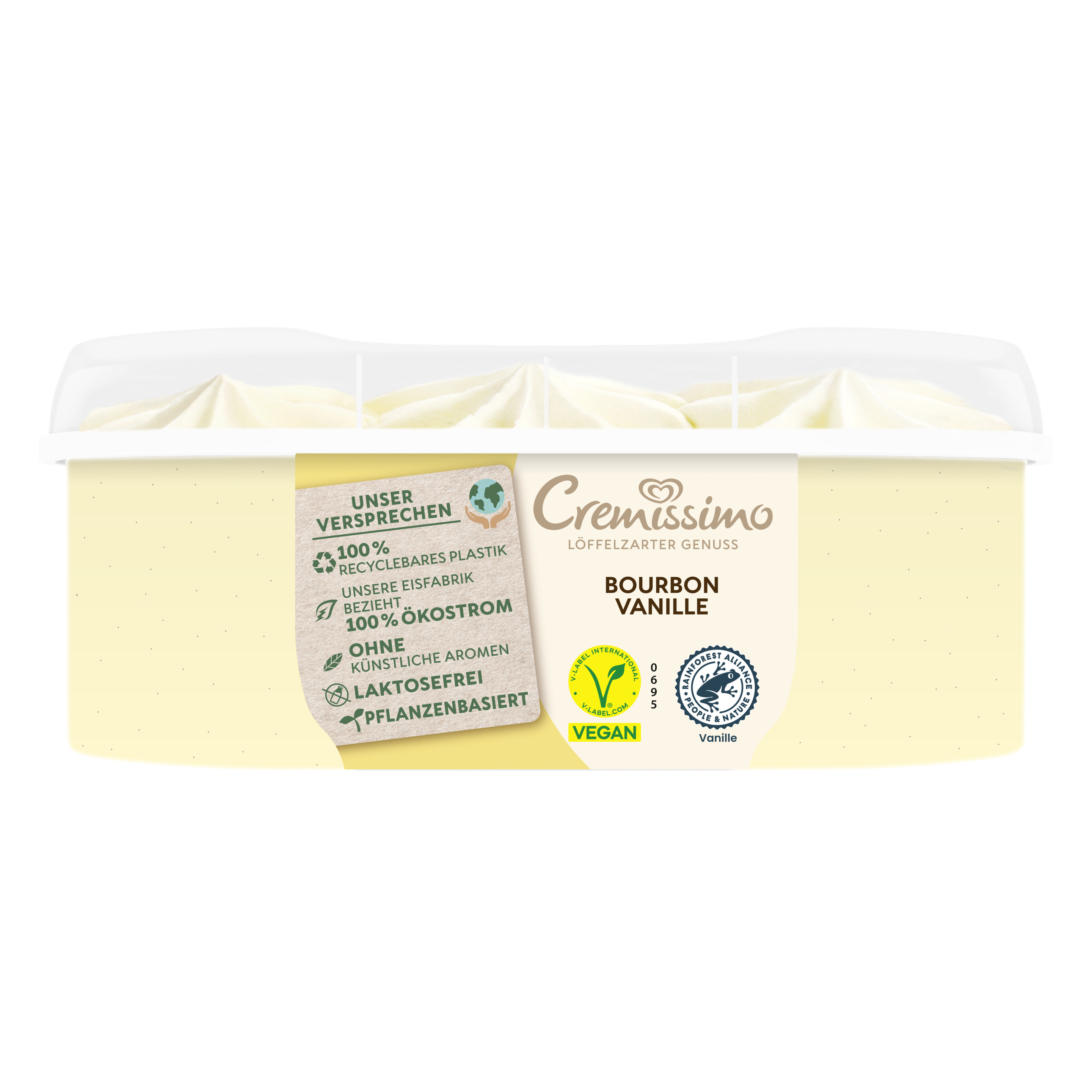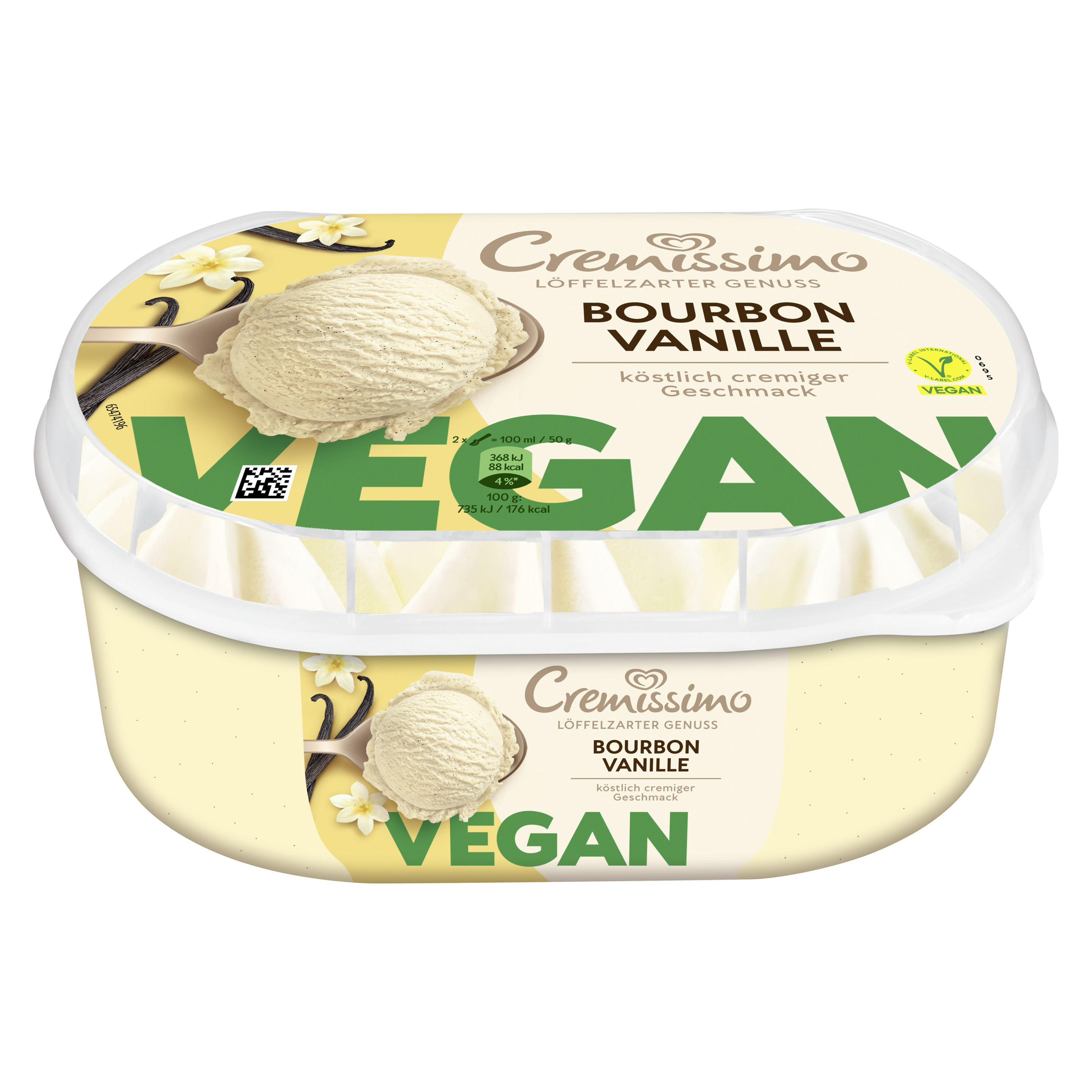 Die erste vegane Variante von Cremissimo – in Österreichs beliebtester Geschmacksrichtung Vanille Pflanzenbasiertes Bourbon Vanille Eis mit köstlich cremigem Geschmack in der typischen Tupfenabfüllung von Cremissimo. Die Bourbon Vanille ist Rainforest Alliance-zertifiziert. Ob pur, zum Kuchen oder in Kombination mit Waffeln und Crêpes – der Eis-Klassiker rundet jedes Dessert perfekt ab und macht es zu einem einmalig raffinierten Genuss. Freude ist am schönsten, wenn man sie teilt. Mit Cremissimo wird die gemeinsame Zeit noch schöner. Löffel für Löffel. Die einzigartig löffelzarte Cremigkeit macht das vegane Vanilleeis von Cremissimo zu einem unvergesslichen Geschmackserlebnis. Ob als krönender Tagesabschluss, wohl verdiente Auszeit zwischendurch, als Dessert für besondere Anlässe oder einfach als Eisgenuss für jeden Tag. Mit Cremissimo wird jeder Moment zu etwas ganz Besonderem. Die große Sortenvielfalt lässt keinen Wunsch offen: Ein Vanilleeis mit der Nachbarin, eine Portion veganes Eis für Freunde oder einen nussigen Kuss für die Liebsten. Cremissimo hat die passende Sorte für jeden Geschmack, vom Schokoeis bis hin zu einem Eis Becher mit Karamell. Egal, wo und egal, mit wem: einfach die Packung aus dem Eisfach holen und sofort loslöffeln. Zudem kann man den Deckel und Becher der Cremissimo Verpackung zu 100% recyceln und dabei helfen, weniger neues Plastik in die Welt zu bringen. Gemeinsam können wir den Plastikkreislauf durch richtiges Recycling schließen. Unser Eis wird in den Cremissimo Eisfabriken hergestellt, die zu 100% Ökostrom beziehen. Denn unsere Vision lautet: die nachhaltigste Verpackung für leckeren Eisgenuss Cremissimo. So schmeckt Zusammensein.