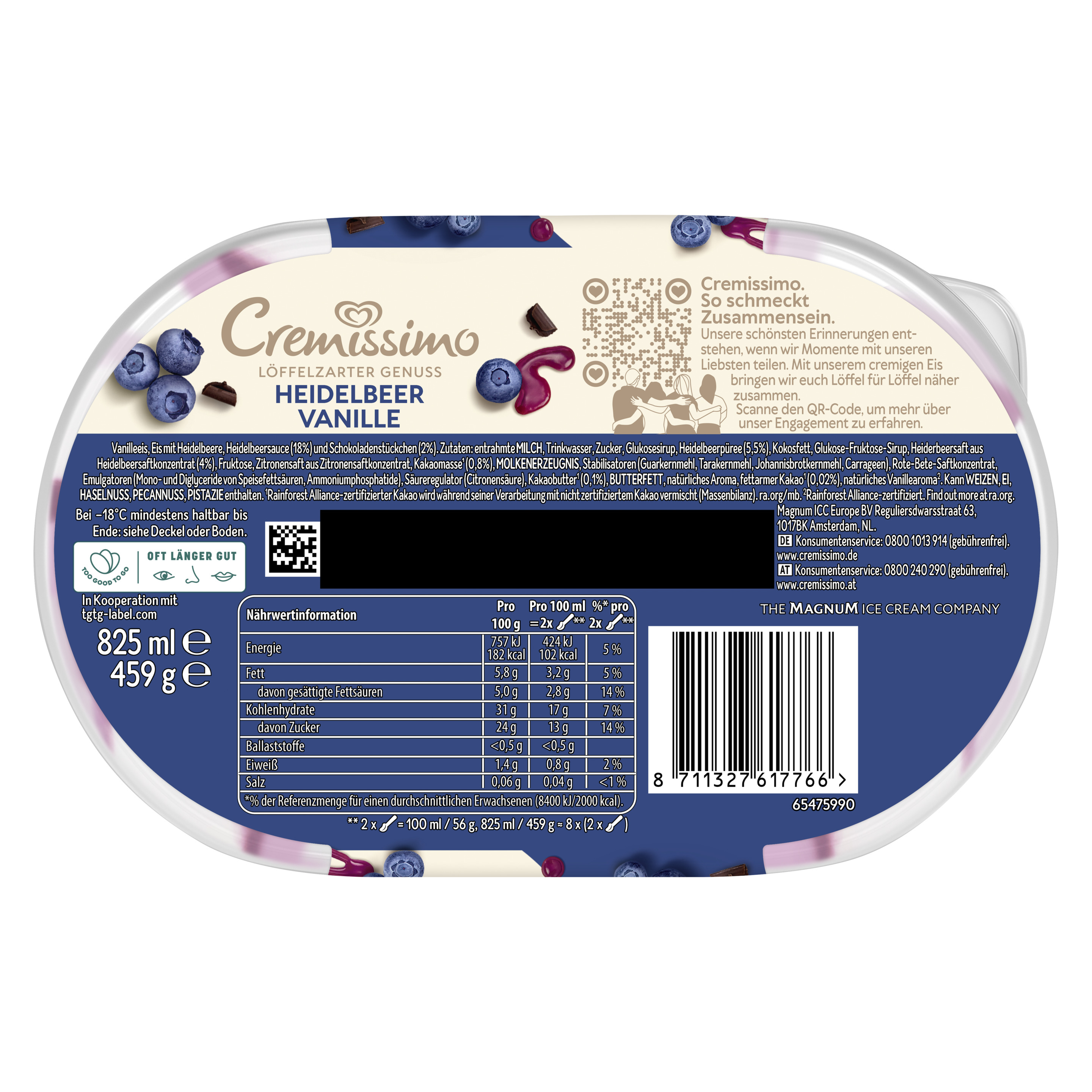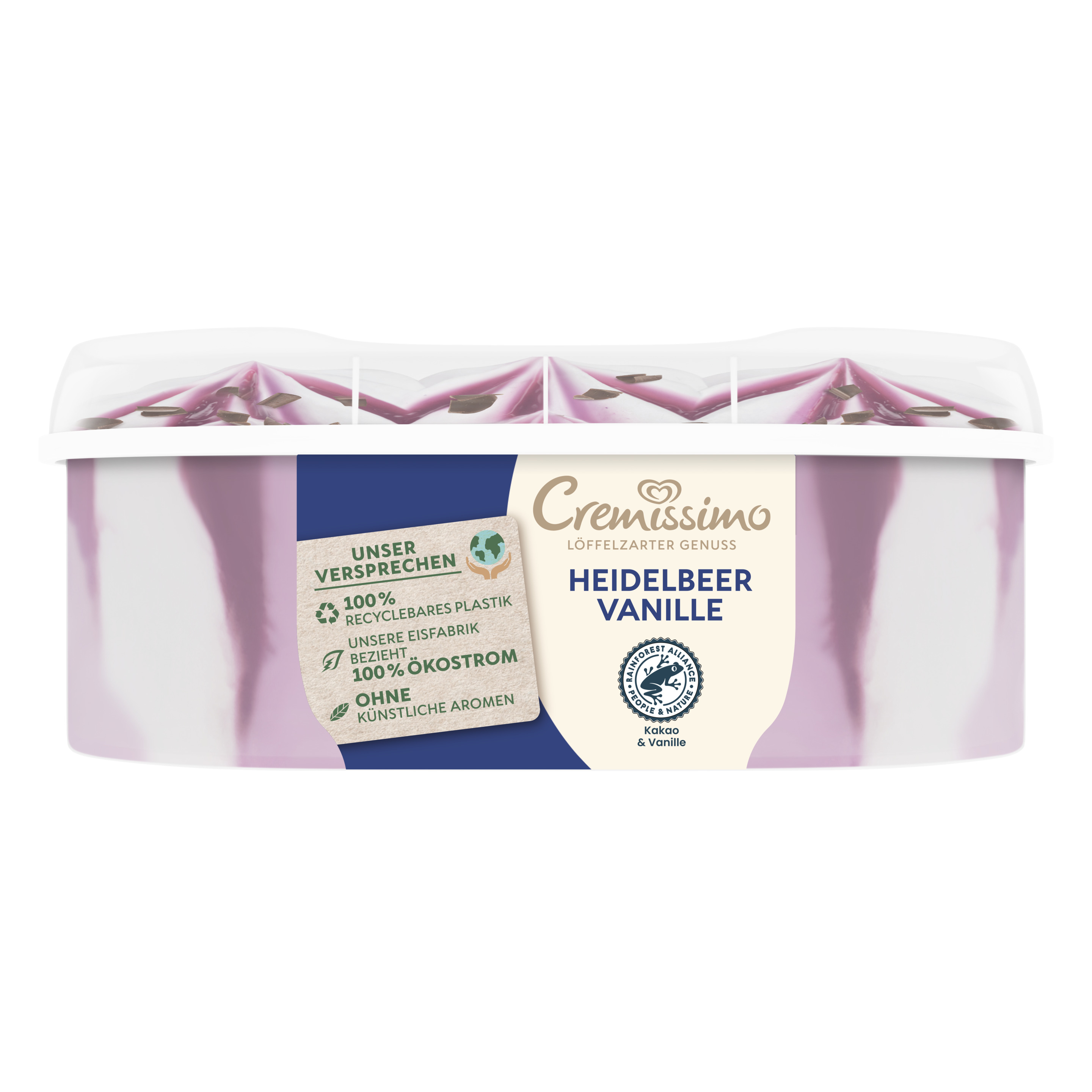 Cremissimo Heidelbeer Vanille kombiniert löffelzartes Eis mit Heidelbeere und Vanilleeis mit Rainforest Alliance-zertifizierter Vanille mit einer fruchtigen Heidelbeersauce und knackigen Schokoladenstückchen mit Rainforest Alliance-zertifiziertem Kakao. Ob pur, zum Kuchen oder in Kombination mit Waffeln und Crêpes – der Eis-Klassiker rundet jedes Dessert perfekt ab und macht es zu einem einmalig raffinierten Eisgenuss. Freude ist am schönsten, wenn man sie teilt. Mit Cremissimo wird die gemeinsame Zeit noch schöner – Löffel für Löffel. Die einzigartig löffelzarte Cremigkeit macht das Vanilleeis im Eis Becher zu einem unvergesslichen Geschmackserlebnis. Ob als krönender Tagesabschluss, wohl verdiente Auszeit zwischendurch, als Dessert für besondere Anlässe oder einfach als Eisgenuss für jeden Tag – mit Cremissimo wird jeder Moment zu etwas ganz Besonderem. Die große Sortenvielfalt lässt keinen Wunsch offen: Ein Vanilleeis mit der Nachbarin, eine Portion veganes Eis für Freunde oder einen nussigen Kuss für die Liebsten. Cremissimo hat die passende Sorte für jeden Geschmack. Egal, wo und egal, mit wem: Einfach die Packung aus dem Eisfach holen und sofort loslöffeln. Zudem kann man den Deckel und Becher der Cremissimo Verpackung zu 100% recyclen und dabei helfen, weniger neues Plastik in die Welt zu bringen. Gemeinsam können wir den Plastikkreislauf durch richtiges Recycling schließen. Unser Eis wird in den Cremissimo Eisfabriken hergestellt, die zu 100% Ökostrom beziehen. Denn unsere Vision lautet: die nachhaltigste Verpackung für leckeren Eisgenuss Cremissimo. So schmeckt Zusammensein.
