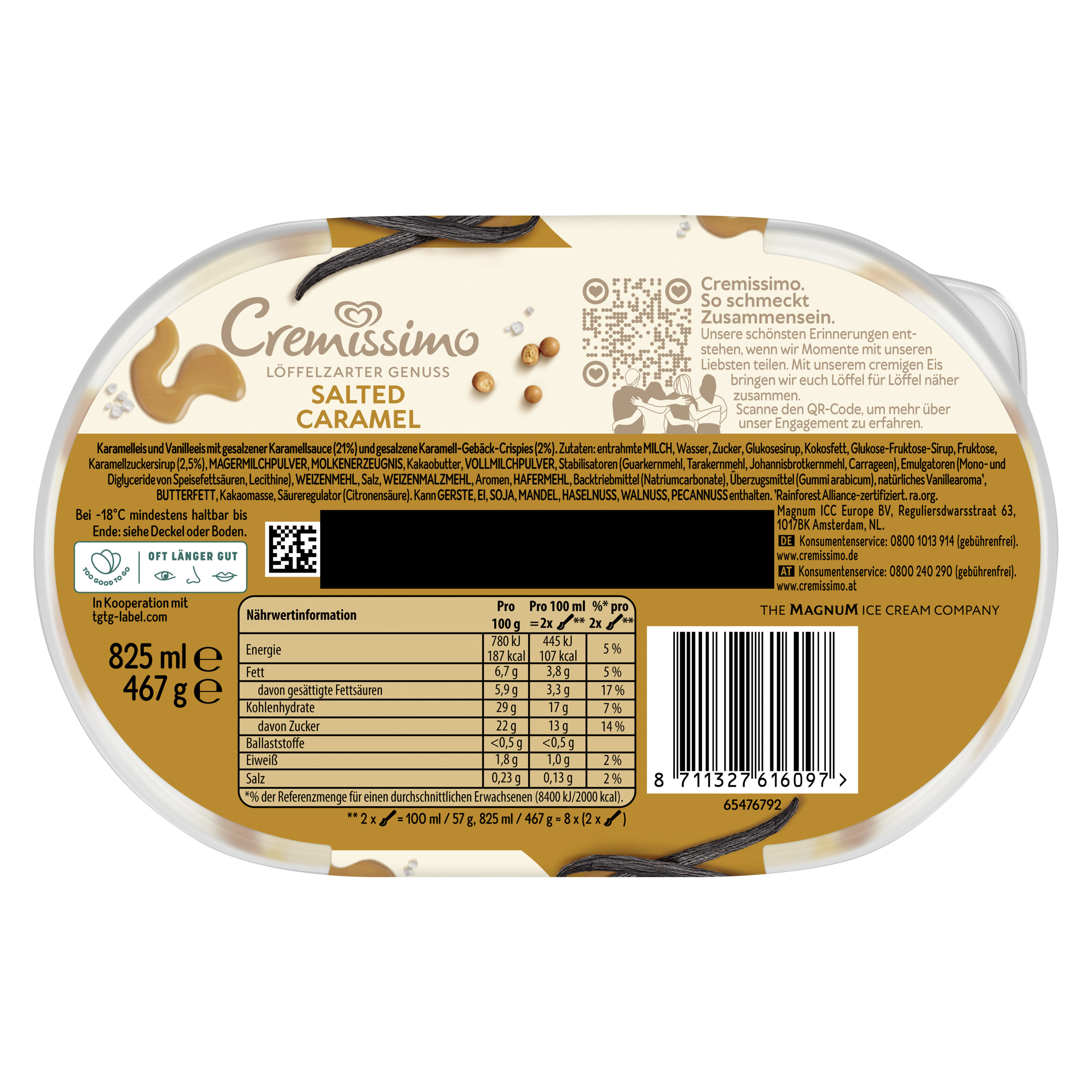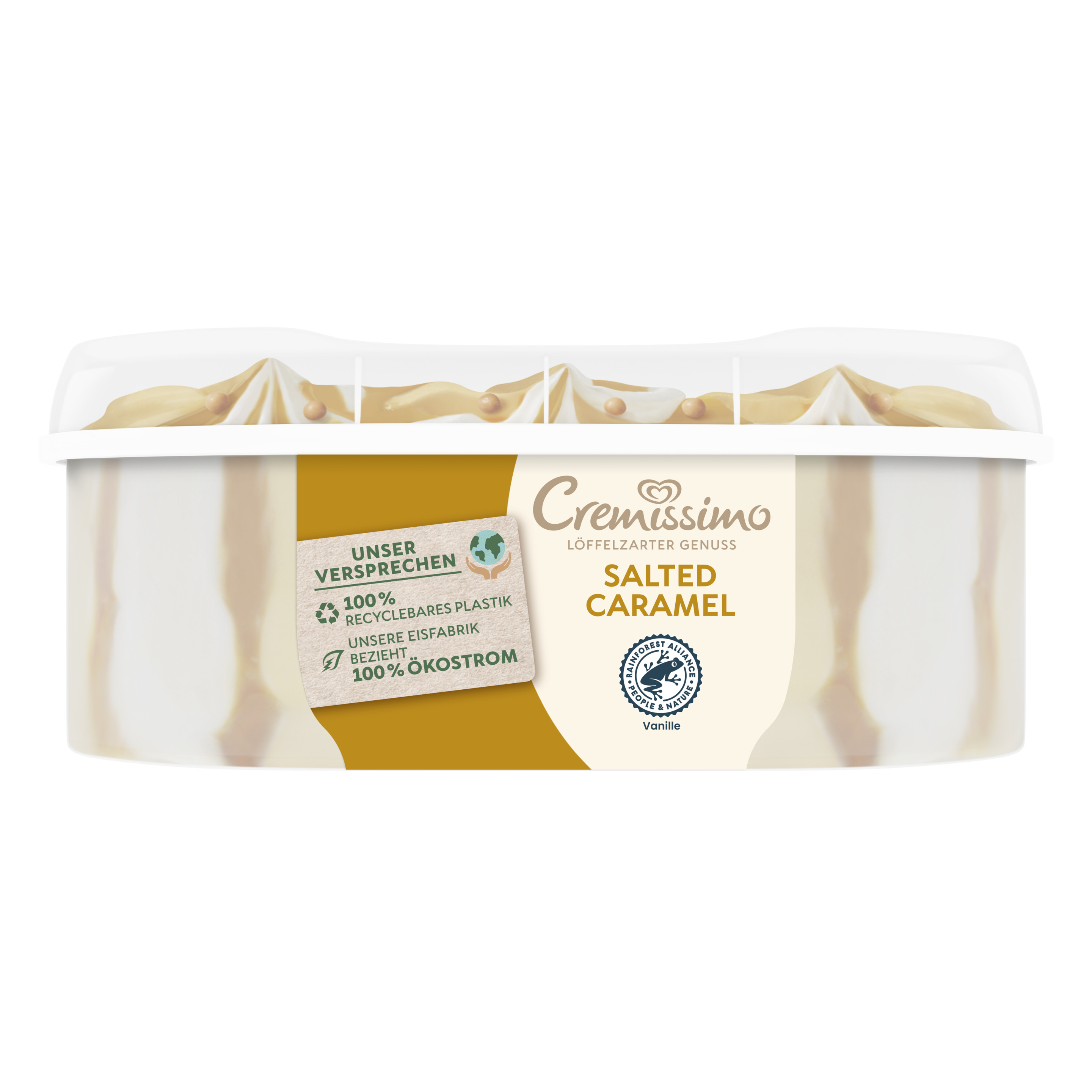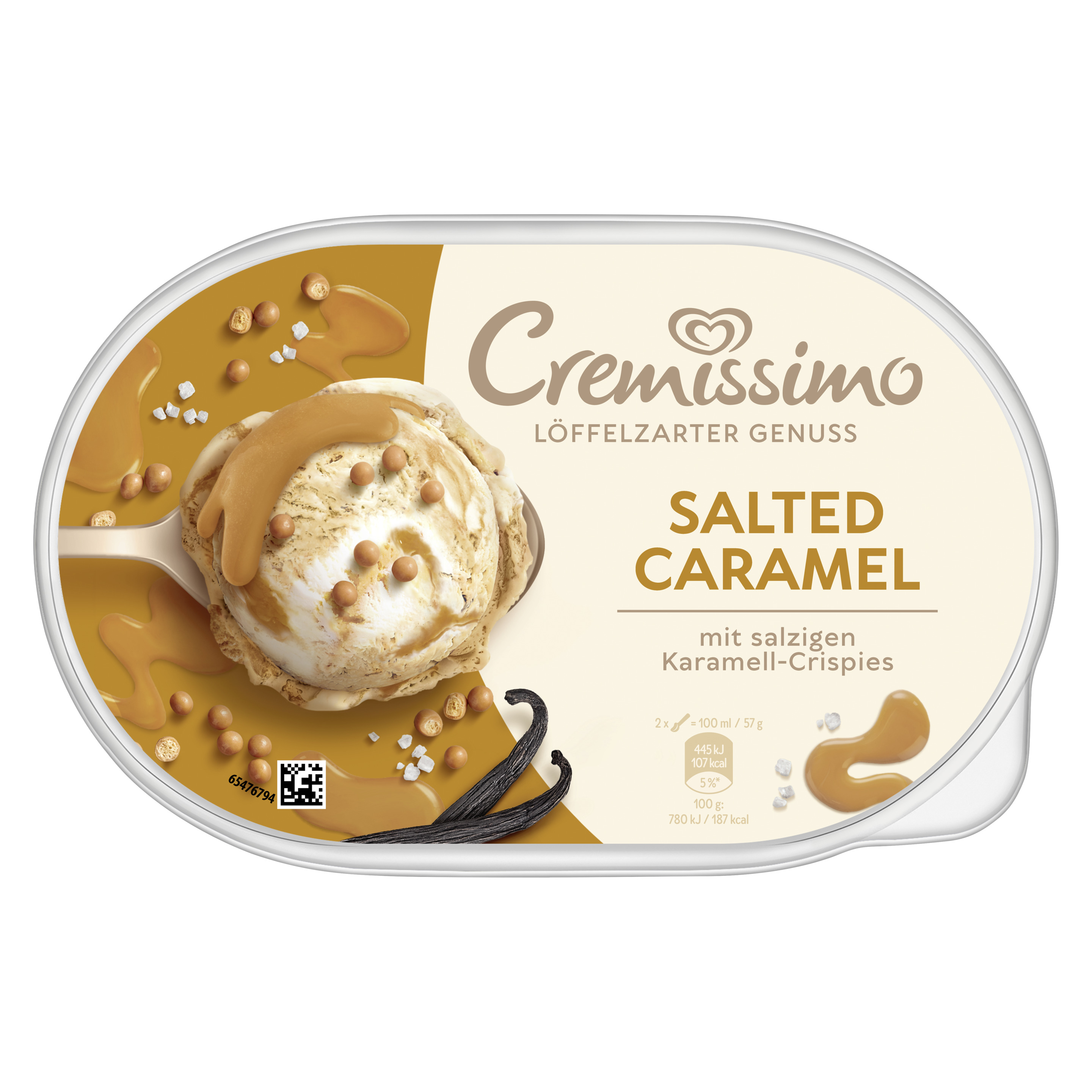 Cremissimo Salted Caramel Eis ist cremiges Karamelleis und Vanilleeis, durchzogen von gesalzener Karamellsauce und verfeinert mit salzigen Karamell-Gebäck-Crispies. Ob pur, zum Kuchen oder in Kombination mit Waffeln und Crêpes – der Eis-Klassiker rundet jedes Dessert perfekt ab und macht es zu einem einmalig raffinierten Eisgenuss. Freude ist am schönsten, wenn man sie teilt. Mit Cremissimo wird die gemeinsame Zeit noch schöner – Löffel für Löffel. Die einzigartig löffelzarte Cremigkeit macht das gesalzene Karamelleis von Cremissimo zu einem unvergesslichen Geschmackserlebnis. Ob als krönender Tagesabschluss, wohl verdiente Auszeit zwischendurch, als Dessert für besondere Anlässe oder einfach als Eisgenuss für jeden Tag – mit Cremissimo wird jeder Moment zu etwas ganz Besonderem. Die große Sortenvielfalt lässt keinen Wunsch offen: Ein Vanilleeis mit der Nachbarin, eine Portion Schokoeis für Freunde oder einen nussigen Kuss für die Liebsten. Cremissimo hat die passende Sorte für jeden Geschmack. Egal, wo und egal, mit wem: Einfach die Packung aus dem Eisfach holen und sofort loslöffeln. Zudem kann man den Deckel und Becher der Cremissimo Verpackung zu 100% recyclen und dabei helfen, weniger neues Plastik in die Welt zu bringen. Gemeinsam können wir den Plastikkreislauf durch richtiges Recycling schließen. Unser Eis wird in den Cremissimo Eisfabriken hergestellt, die zu 100% Ökostrom beziehen. Denn unsere Vision lautet: die nachhaltigste Verpackung für leckeren Eisgenuss Cremissimo. So schmeckt Zusammensein.
