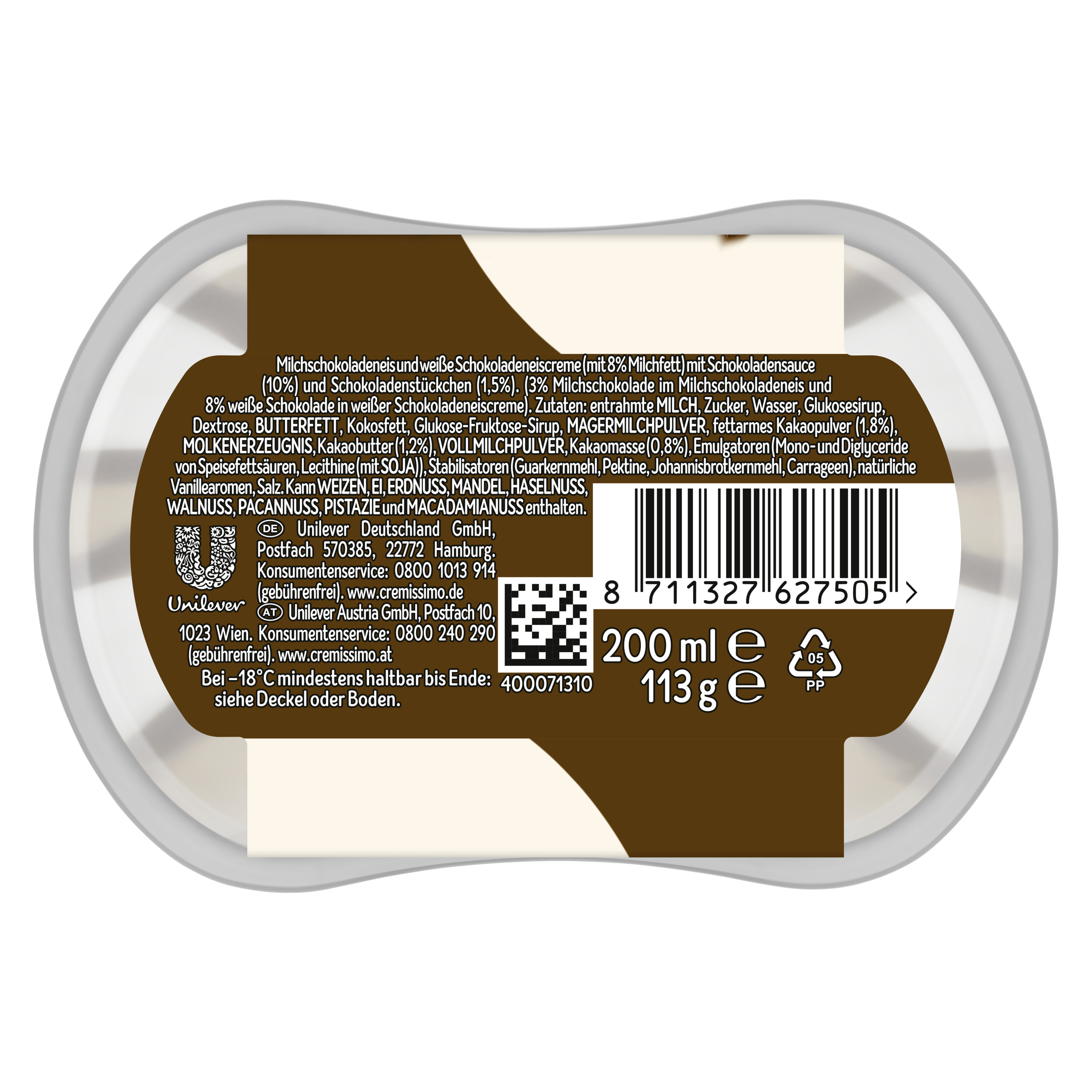 Zutaten: entrahmte MILCH, Zucker, Wasser, Glukosesirup, Dextrose, BUTTERFETT, Kokosfett, Glukose-Fruktose-Sirup, MAGERMILCHPULVER, fettarmes Kakaopulver (1,8%), MOLKENERZEUGNIS, Kakaobutter (1,2%), VOLLMILCHPULVER, Kakaomasse (0,8%), Emulgatoren (Mono- und Diglyceride von Speisefettsäuren, Lecithine (mit SOJA)), Stabilisatoren (Guarkernmehl, Pektine, Johannisbrotkernmehl, Carrageen), natürliche Vanillearomen, Salz. Kann WEIZEN, EI, ERDNUSS, MANDEL, HASELNUSS, WALNUSS, PECANNUSS, PISTAZIE und MACADAMIANUSS enthalten.