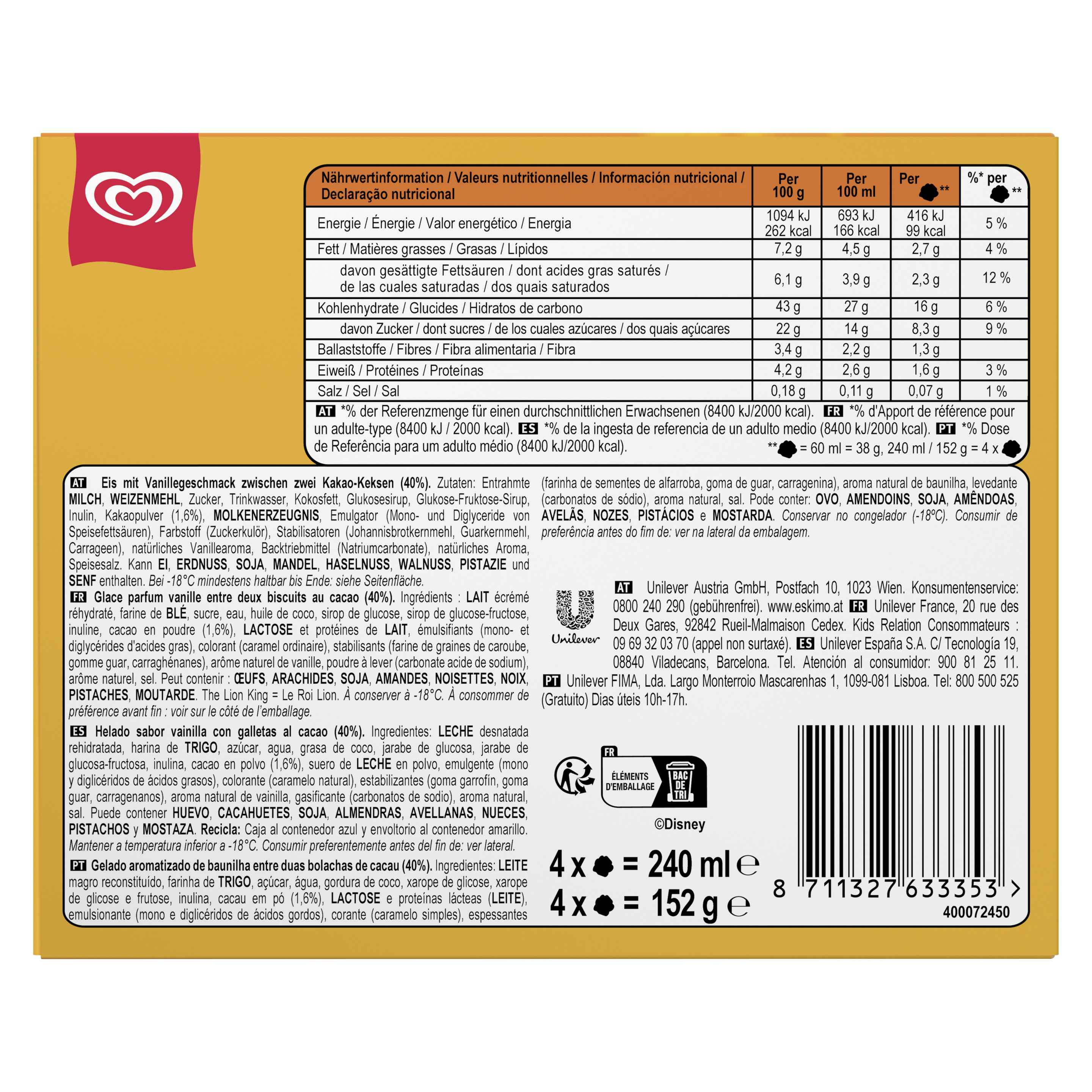 Entdecke das Disney® Lion King Eiscreme-Sandwich im 4er Mulitpack Leckere Eiscreme mit Vanillegeschmack zwischen zwei Kakao-Keksen in Form von Simba's Pfotenabdruck.