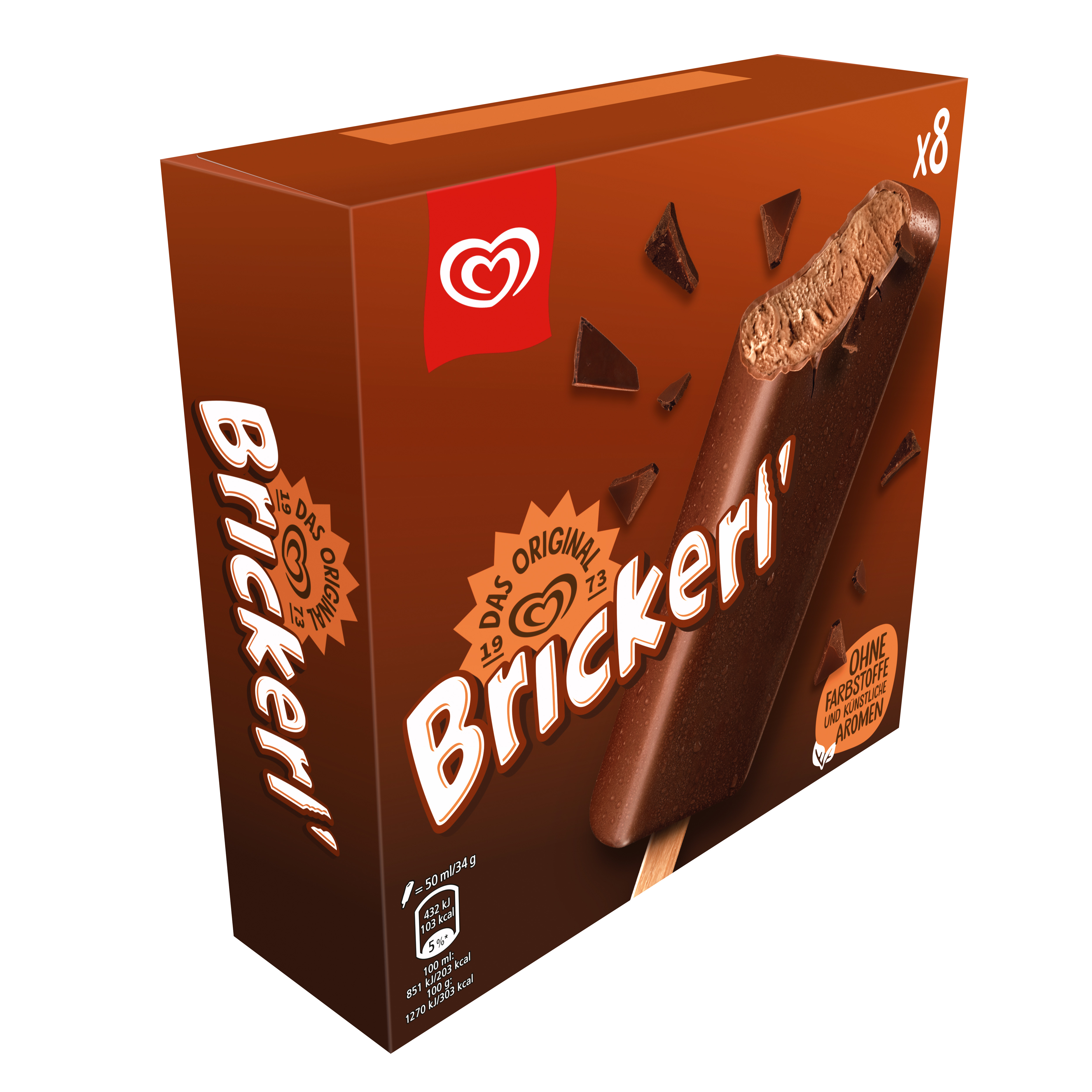 Brickerl, das Original Kult-Eis von Eskimo seit 1973, ist eine Legende in Österreich! Unser Eskimo Brickerl ist der perfekte Snack für zwischendurch - klein, lecker und gleich doppelt schokoladig. Der wahre Genuss für Schoko-Liebhaber - unvergleichliches Schokoladeneis mit köstlicher Kakaoglasur. Der kleine Schokoklassiker in der 8x50ml Packung.