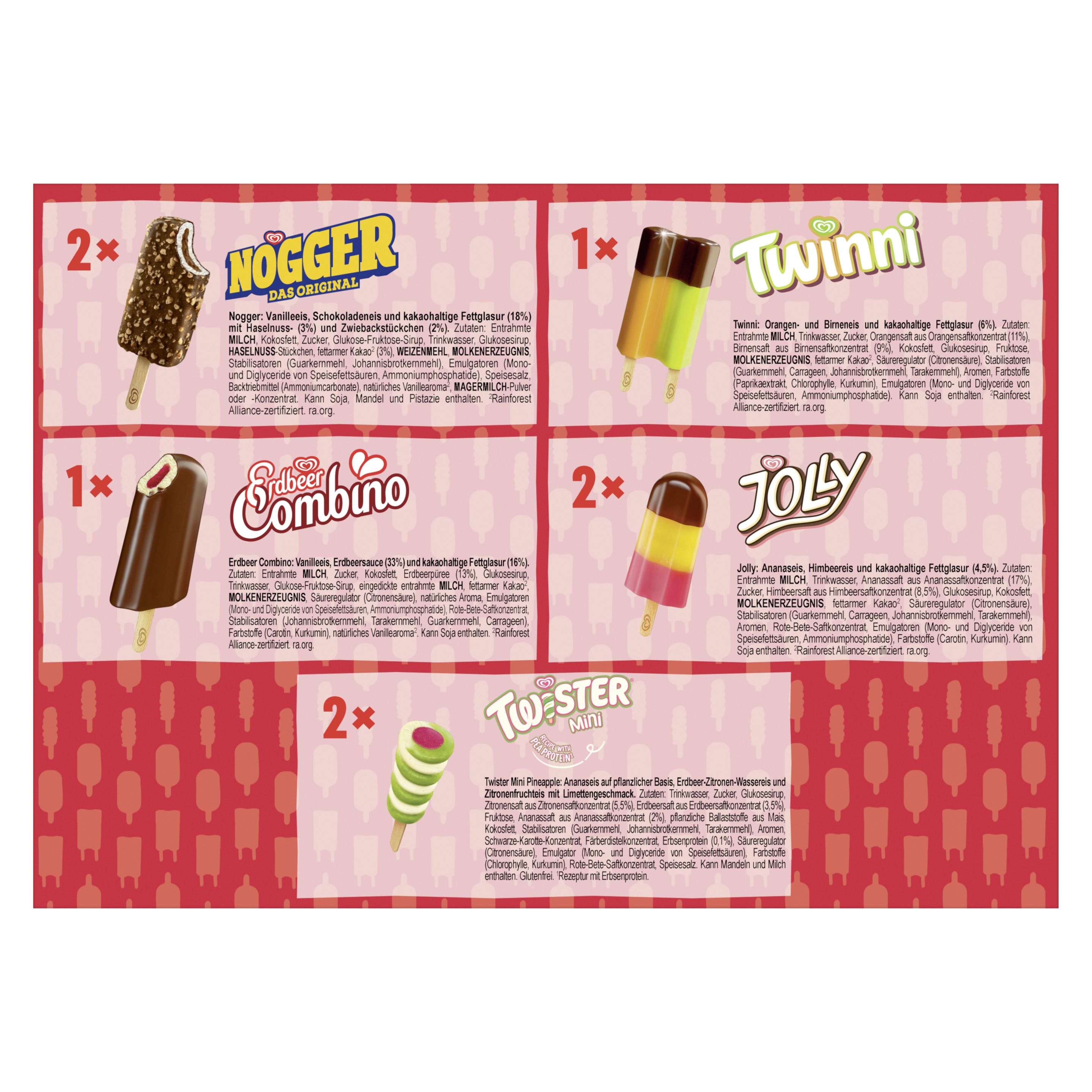 Zutaten: #Eis Legenden - Erdbeer Combino Zutaten: Entrahmte MILCH, Zucker, Kokosfett, Erdbeerpüree (13%), Glukosesirup, Trinkwasser, Glukose-Fruktose-Sirup, eingedickte entrahmte MILCH, fettarmer Kakao², MOLKENERZEUGNIS, Säureregulator (Citronensäure), natürliches Aroma, Emulgatoren (Mono- und Diglyceride von Speisefettsäuren, Ammoniumphosphatide), Rote-Bete-Saftkonzentrat, Stabilisatoren (Johannisbrotkernmehl, Tarakernmehl, Guarkernmehl, Carrageen), Farbstoffe (Carotin, Kurkumin), natürliches Vanillearoma². Kann Soja enthalten. ²Rainforest Alliance-zertifiziert. #Eis Legenden - Jolly Zutaten: Entrahmte MILCH, Trinkwasser, Ananassaft aus Ananassaftkonzentrat (17%), Zucker, Himbeersaft aus Himbeersaftkonzentrat (8,5%), Glukosesirup, Kokosfett, MOLKENERZEUGNIS, fettarmer Kakao², Säureregulator (Citronensäure), Stabilisatoren (Guarkernmehl, Carrageen, Johannisbrotkernmehl, Tarakernmehl), Aromen, Rote-Bete-Saftkonzentrat, Emulgatoren (Mono- und Diglyceride von Speisefettsäuren, Ammoniumphosphatide), Farbstoffe (Carotin, Kurkumin). Kann Soja enthalten. ²Rainforest Alliance-zertifiziert. #Eis Legenden - Nogger Zutaten: Entrahmte MILCH, Kokosfett, Zucker, Glukose-Fruktose-Sirup, Trinkwasser, Glukosesirup, HASELNUSS-Stückchen, fettarmer Kakao² (3%), WEIZENMEHL, MOLKENERZEUGNIS, Stabilisatoren (Guarkernmehl, Johannisbrotkernmehl), Emulgatoren (Mono- und Diglyceride von Speisefettsäuren, Ammoniumphosphatide), Speisesalz, Backtriebmittel (Ammoniumcarbonate), natürliches Vanillearoma², MAGERMILCH-Pulver oder -Konzentrat. Kann Soja, Mandel und Pistazie enthalten. ²Rainforest Alliance-zertifiziert. #Eis Legenden - Twinni Zutaten: Entrahmte MILCH, Trinkwasser, Zucker, Orangensaft aus Orangensaftkonzentrat (11%), Birnensaft aus Birnensaftkonzentrat (9%), Kokosfett, Glukosesirup, Fruktose, MOLKENERZEUGNIS, fettarmer Kakao², Säureregulator (Citronensäure), Stabilisatoren (Guarkernmehl, Carrageen, Johannisbrotkernmehl, Tarakernmehl), Aromen, Farbstoffe (Paprikaextrakt, Chlorophylle, Kurkumin), Emulgatoren (Mono- und Diglyceride von Speisefettsäuren, Ammoniumphosphatide). Kann Soja enthalten. ²Rainforest Alliance-zertifiziert. #Eis Legenden - Twister Mini Pineapple Zutaten: utaten: Trinkwasser, Zucker, Glukosesirup, Zitronensaft aus Zitronensaftkonzentrat (5,5%), Erdbeersaft aus Erdbeersaftkonzentrat (3,5%), Fruktose, Ananassaft aus Ananassaftkonzentrat (2%), pflanzliche Ballaststoffe aus Mais, Kokosfett, Stabilisatoren (Guarkernmehl, Johannisbrotkernmehl, Tarakernmehl), Aromen, Schwarze-Karotte-Konzentrat, Färberdistelkonzentrat, Erbsenprotein (0,1%), Säureregulator (Citronensäure), Emulgator (Mono- und Diglyceride von Speisefettsäuren), Farbstoffe (Chlorophylle, Kurkumin), Rote-Bete-Saftkonzentrat, Speisesalz. Kann Mandeln und Milch enthalten.