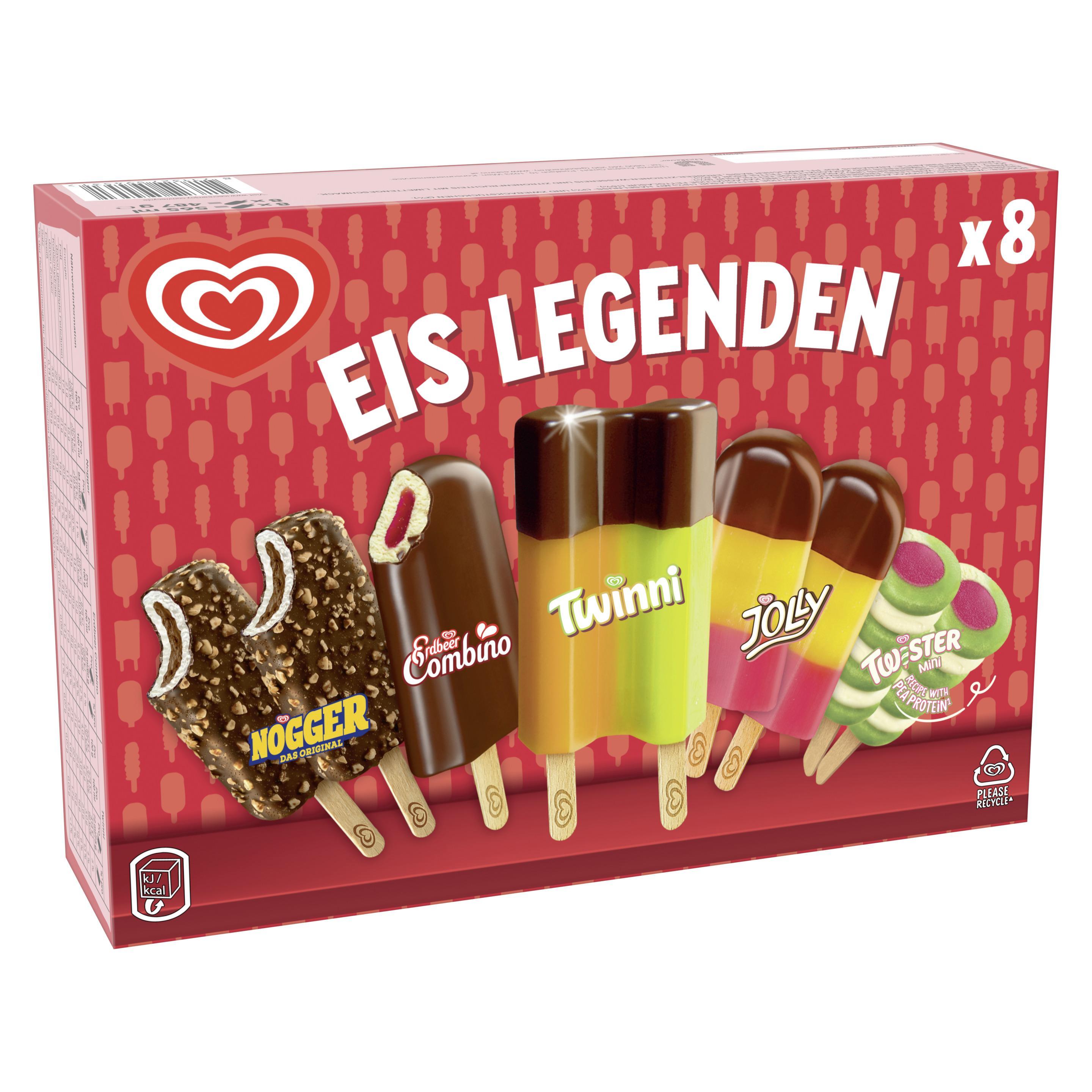 Mit den Eskimo Eislegenden kommt geballte Eisnostalgie in einer Box – acht legendäre Sorten, die Eisgenussgeschichte geschrieben haben. Die Packung enthält: 2x Nogger mit knackiger Schokolade und nussiger Note, 1x Erdbeer Combino – fruchtig-cremig mit Schokohülle, 1x Twinni – das kunterbunte Eisvergnügen mit zwei Geschmacksrichtungen in einem, 2x Jolly – der österreichische Kultklassiker in Rot-Gelb-Schwarz und 2x Twister Pineapple – tropisch-fruchtig mit dem gewissen Dreh.