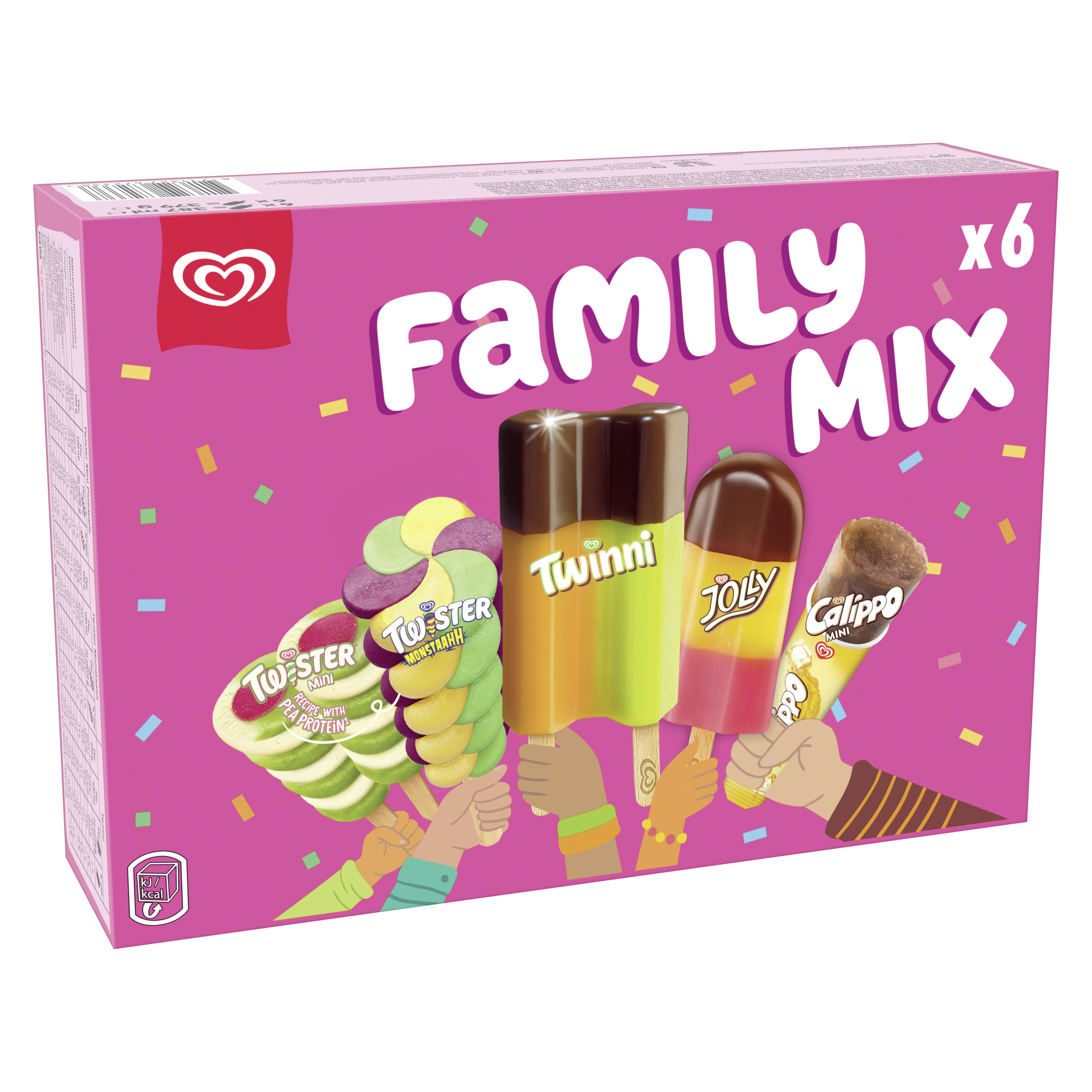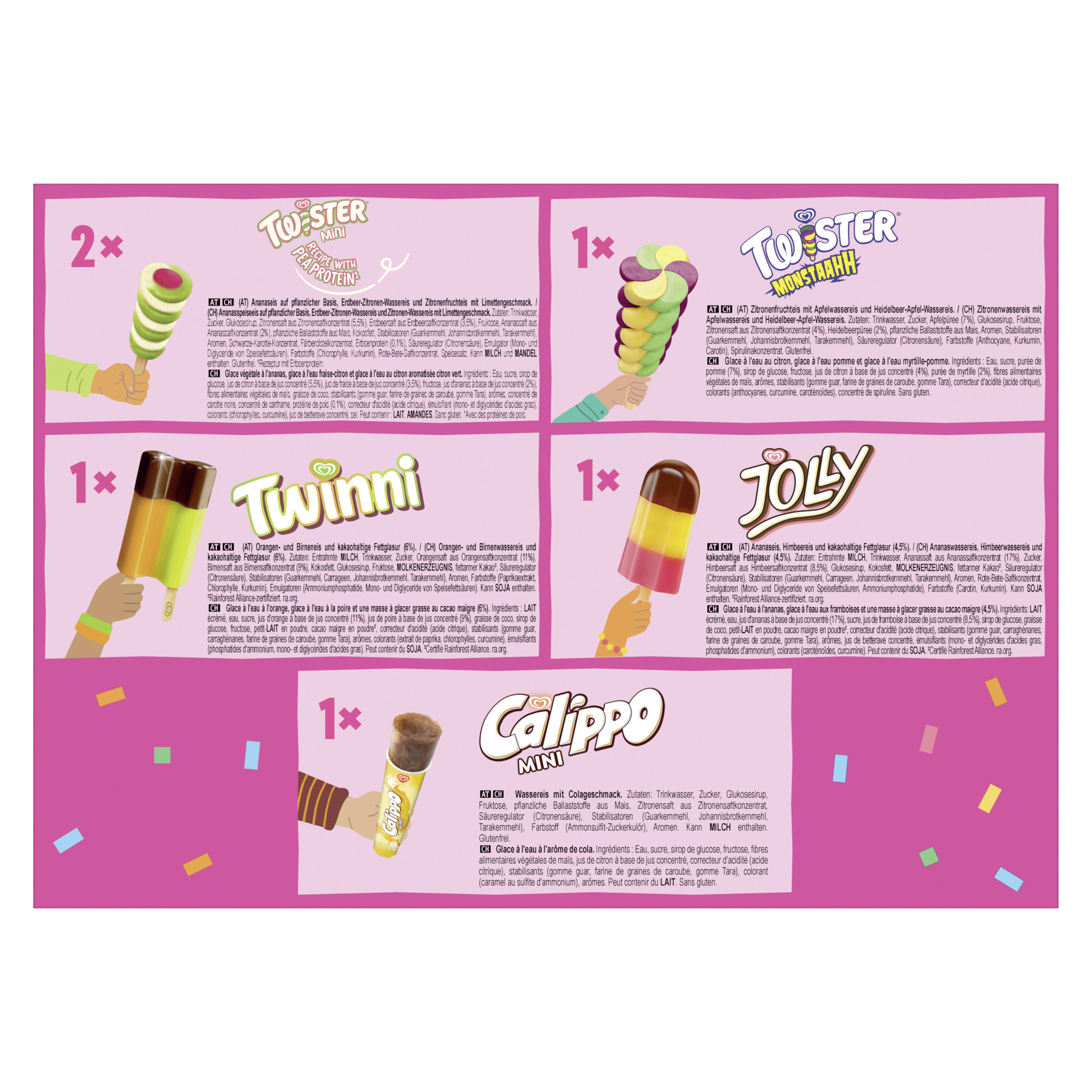 Zutaten: #Family Mix - Jolly Zutaten: Entrahmte MILCH, Trinkwasser, Ananassaft aus Ananassaftkonzentrat (17%), Zucker, Himbeersaft aus Himbeersaftkonzentrat (8,5%), Glukosesirup, Kokosfett, MOLKENERZEUGNIS, fettarmer Kakao², Säureregulator (Citronensäure), Stabilisatoren (Guarkernmehl, Carrageen, Johannisbrotkernmehl, Tarakernmehl), Aromen, Rote-Bete-Saftkonzentrat, Emulgatoren (Mono- und Diglyceride von Speisefettsäuren, Ammoniumphosphatide), Farbstoffe (Carotin, Kurkumin). Kann SOJA enthalten. ²Rainforest Alliance-zertifiziert. #Family Mix - Mini Calippo Cola Zutaten: Trinkwasser, Zucker, Glukosesirup, Fruktose, pflanzliche Ballaststoffe aus Mais, Zitronensaft aus Zitronensaftkonzentrat, Säureregulator (Citronensäure), Stabilisatoren (Guarkernmehl, Johannisbrotkernmehl, Tarakernmehl), Farbstoff (Ammonsulfit-Zuckerkulör), Aromen. Kann MILCH enthalten. #Family Mix - Twinni Zutaten: Entrahmte MILCH, Trinkwasser, Zucker, Orangensaft aus Orangensaftkonzentrat (11%), Birnensaft aus Birnensaftkonzentrat (9%), Kokosfett, Glukosesirup, Fruktose, MOLKENERZEUGNIS, fettarmer Kakao², Säureregulator (Citronensäure), Stabilisatoren (Guarkernmehl, Carrageen, Johannisbrotkernmehl, Tarakernmehl), Aromen, Farbstoffe (Paprikaextrakt, Chlorophylle, Kurkumin), Emulgatoren (Ammoniumphosphatide, Mono- und Diglyceride von Speisefettsäuren). Kann SOJA enthalten. ²Rainforest Alliance-zertifiziert. #Family Mix - Twister Mini Pineapple Zutaten: Trinkwasser, Zucker, Glukosesirup, Zitronensaft aus Zitronensaftkonzentrat (5,5%), Erdbeersaft aus Erdbeersaftkonzentrat (3,5%), Fruktose, Ananassaft aus Ananassaftkonzentrat (2%), pflanzliche Ballaststoffe aus Mais, Kokosfett, Stabilisatoren (Guarkernmehl, Johannisbrotkernmehl, Tarakernmehl), Aromen, Schwarze-Karotte-Konzentrat, Färberdistelkonzentrat, Erbsenprotein (0,1%), Säureregulator (Citronensäure), Emulgator (Mono- und Diglyceride von Speisefettsäuren), Farbstoffe (Chlorophylle, Kurkumin), Rote-Bete-Saftkonzentrat, Speisesalz. Kann MILCH und MANDEL enthalten. #Family Mix - Twister Monstaahh Zutaten: Trinkwasser, Zucker, Apfelpüree (7%), Glukosesirup, Fruktose, Zitronensaft aus Zitronensaftkonzentrat (4%), Heidelbeerpüree (2%), pflanzliche Ballaststoffe aus Mais, Aromen, Stabilisatoren (Guarkernmehl, Johannisbrotkernmehl, Tarakernmehl), Säureregulator (Citronensäure), Farbstoffe (Anthocyane, Kurkumin, Carotin), Spirulinakonzentrat.