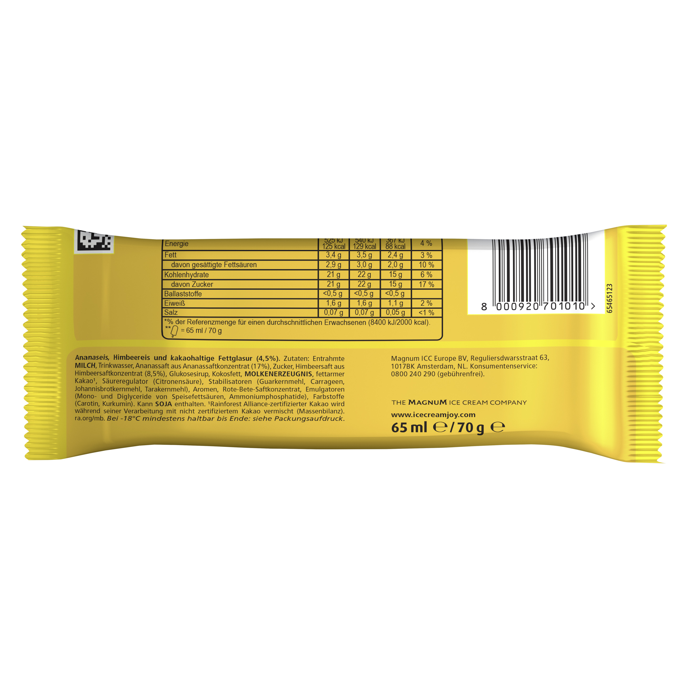 Zutaten: Entrahmte MILCH, Trinkwasser, Ananassaft aus Ananassaftkonzentrat (17%), Zucker, Himbeersaft aus Himbeersaftkonzentrat (8,5%), Glukosesirup, Kokosfett, MOLKENERZEUGNIS, fettarmer Kakao¹, Säureregulator (Citronensäure), Stabilisatoren (Guarkernmehl, Carrageen, Johannisbrotkernmehl, Tarakernmehl), Aromen, Rote-Bete-Saftkonzentrat, Emulgatoren (Mono- und Diglyceride von Speisefettsäuren, Ammoniumphosphatide), Farbstoffe (Carotin, Kurkumin). Kann SOJA enthalten. ¹Rainforest Alliance-zertifizierter Kakao wird während seiner Verarbeitung mit nicht zertifiziertem Kakao vermischt (Massenbilanz).