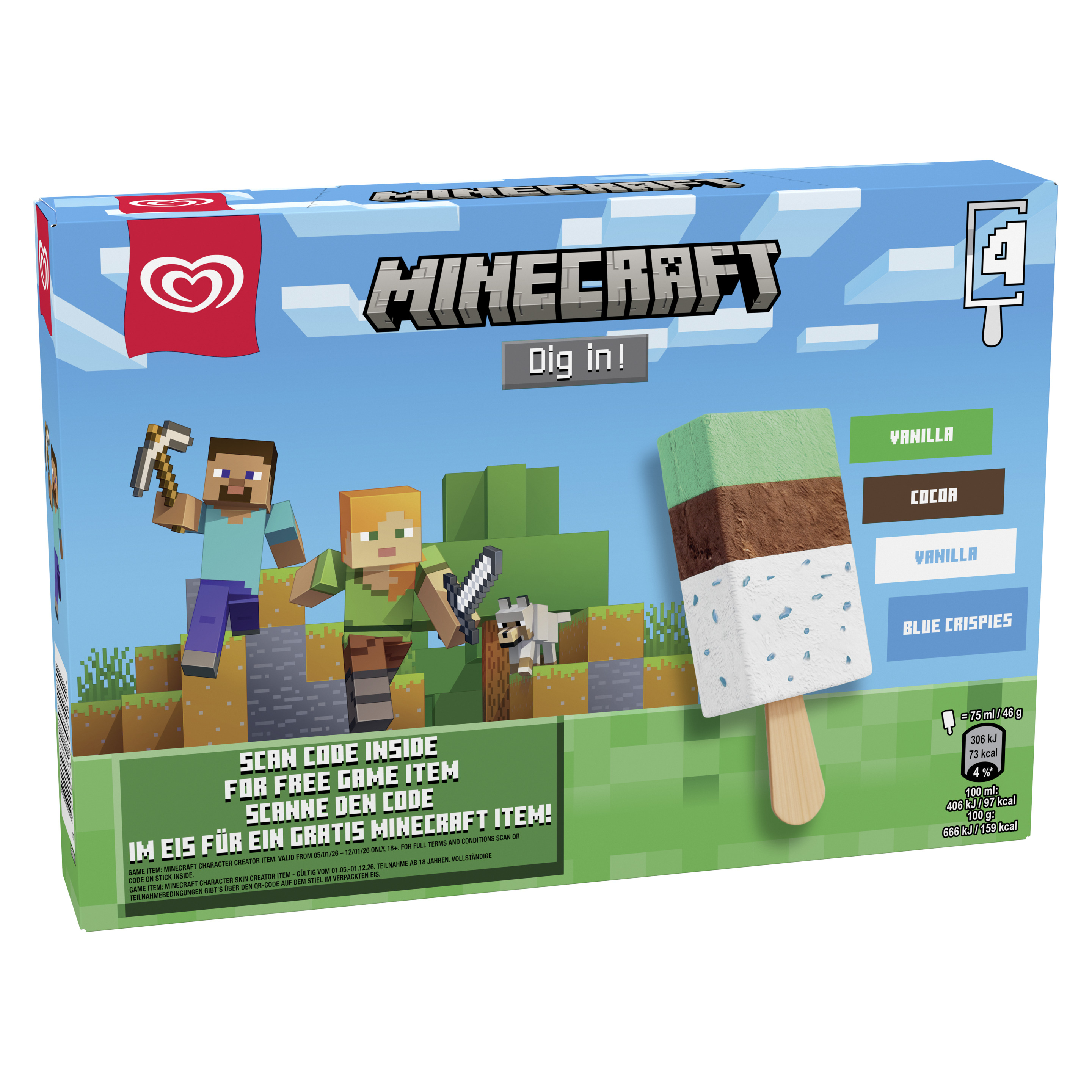 Bei Eskimo Minecraft trifft eines der beliebtesten virtuellen Spiele auf köstlichen Eisgenuss. Das Eis vereint 3 verschiedene Schichten aus grün gefärbtem Vanilleeis, Schokoladeneis und Vanilleeis mit blau gefärbten Knusperkügelchen. Dazu kann man sich neben dem Eis auch ein cooles Minecraft Item sichern. Einfach den QR-Code auf dem Eisstiel scannen und den Anweisungen folgen. Das Minecraft Eis am Stiel ist ein spaßiger Eis-Snack zwischendurch, denn die verschiedenen Schichten Eis lassen jeden Fan mit Eskimo in die virtuelle Minecraft-Welt eintauchen. Ob groß oder klein – Naschen macht das Leben bunter und ist im Rahmen einer gesunden, ausgewogenen Ernährung und eines aktiven Lebensstils völlig okay. Das heutige Eskimo Logo, das unverkennbare Herz, ist ein Zeichen, das von Kindern und Erwachsenen überall auf der Welt verstanden wird. Eskimo hat es sich zur Aufgabe gemacht, dafür zu sorgen, dass Menschen auf der ganzen Welt mehr Happy Moments zusammen genießen können. Denn Happiness, also Glücklichsein, ist weder Zufall noch von außen vorbestimmt. Es ist etwas, für das jeder etwas tun kann. Jeden Tag kann man dafür nutzen, glücklichere Entscheidungen zu treffen.