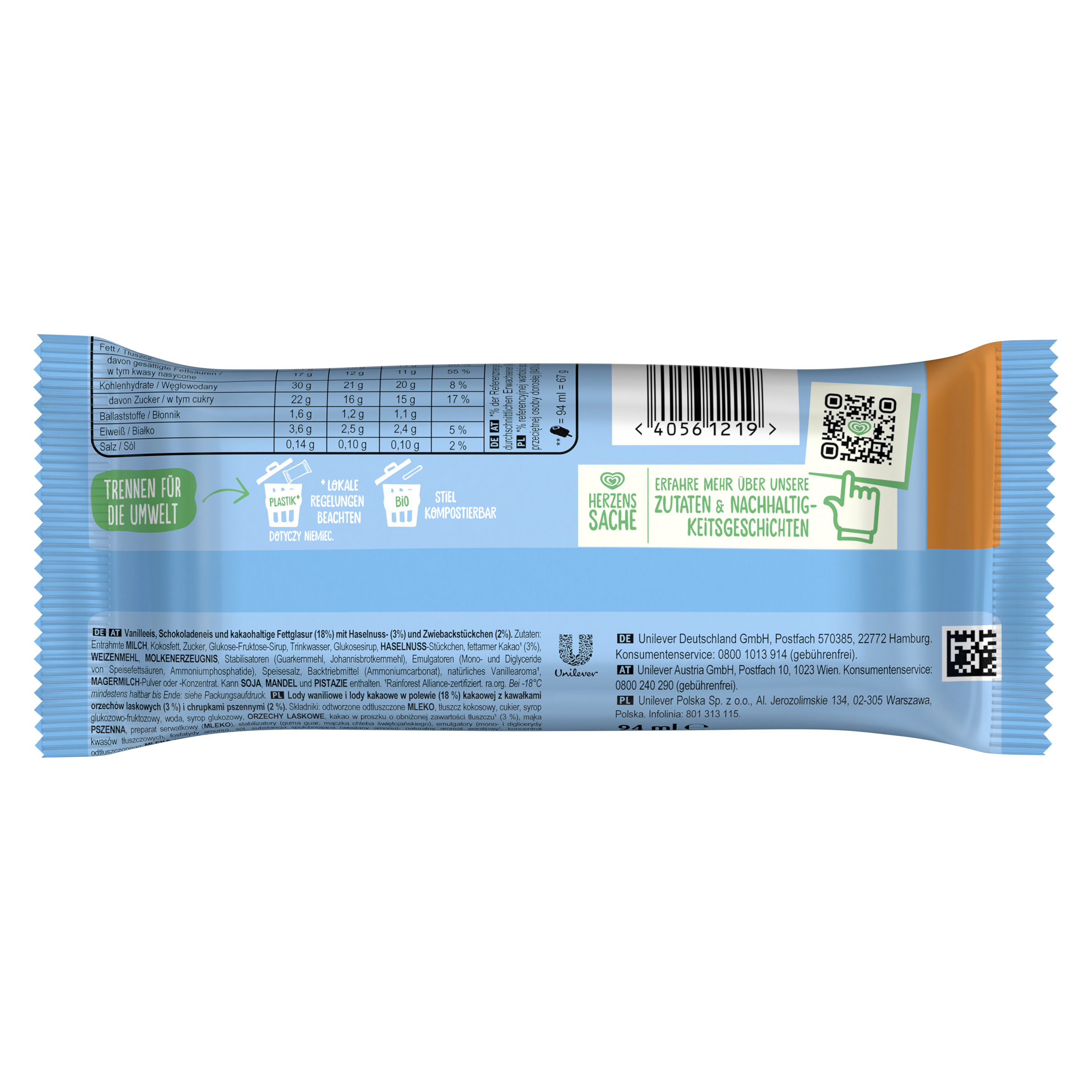 Zutaten: Entrahmte MILCH, Kokosfett, Zucker, Glukose-Fruktose-Sirup, Trinkwasser, Glukosesirup, HASELNUSS-Stückchen, fettarmer Kakao¹ (3%), WEIZENMEHL, MOLKENERZEUGNIS, Stabilisatoren (Guarkernmehl, Johannisbrotkernmehl), Emulgatoren (Mono- und Diglyceride von Speisefettsäuren, Ammoniumphosphatide), Speisesalz, Backtriebmittel (Ammoniumcarbonat), natürliches Vanillearoma¹, MAGERMILCH-Pulver oder -Konzentrat. Kann SOJA, MANDEL und PISTAZIE enthalten. ¹Rainforest Alliance-zertifiziert.