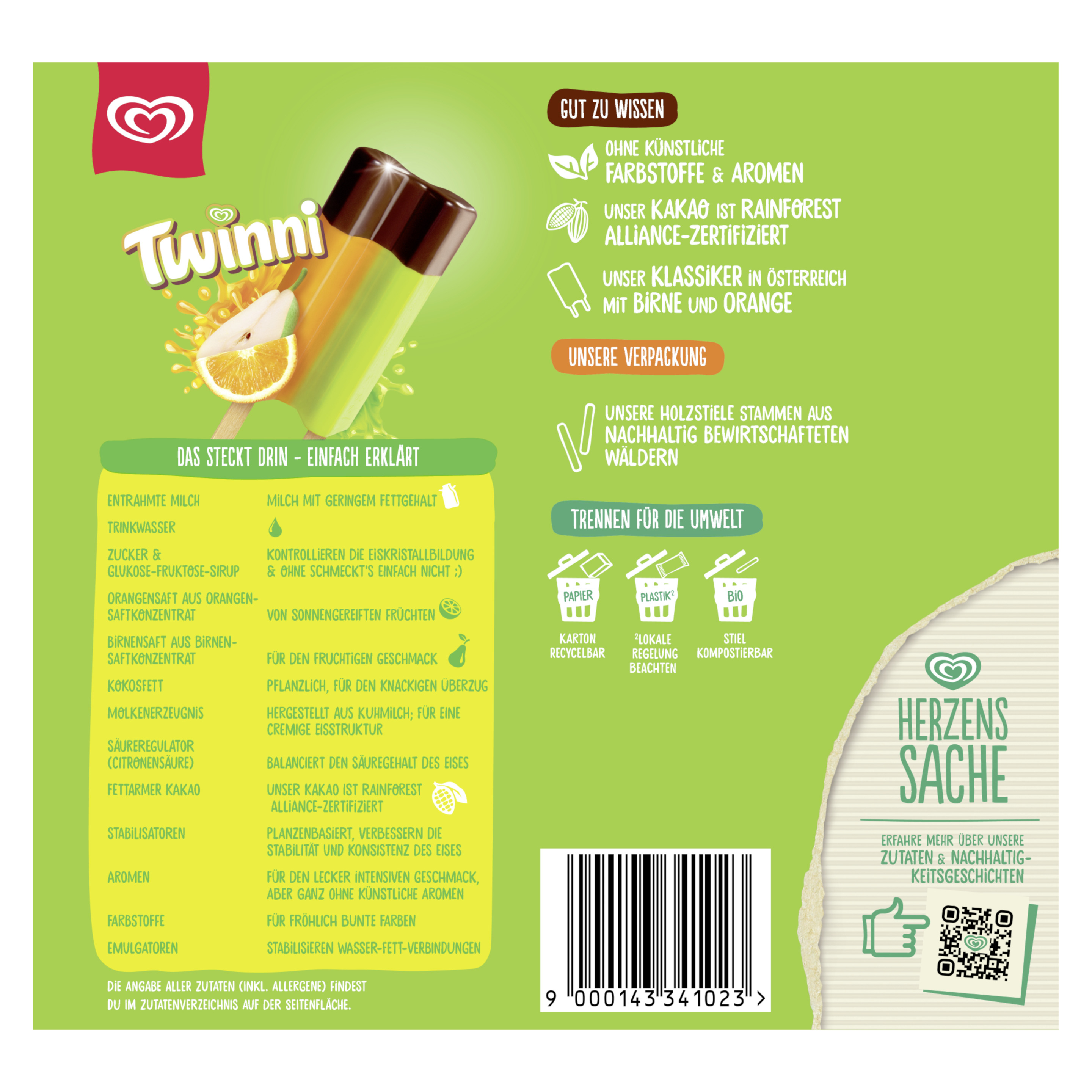Zutaten: Entrahmte MILCH, Trinkwasser, Zucker, Orangensaft aus Orangensaftkonzentrat (11%), Birnensaft aus Birnensaftkonzentrat (9%), Kokosfett, Glukosesirup, Fruktose, MOLKENERZEUGNIS, fettarmer Kakao¹, Säureregulator (Citronensäure), Stabilisatoren (Guarkernmehl, Carrageen, Johannisbrotkernmehl, Tarakernmehl), Aromen, Farbstoffe (Paprikaextrakt, Chlorophylle, Kurkumin), Emulgatoren (Ammoniumphosphatide, Mono- und Diglyceride von Speisefettsäuren). Kann SOJA enthalten. ¹Rainforest Alliance-zertifiziert.