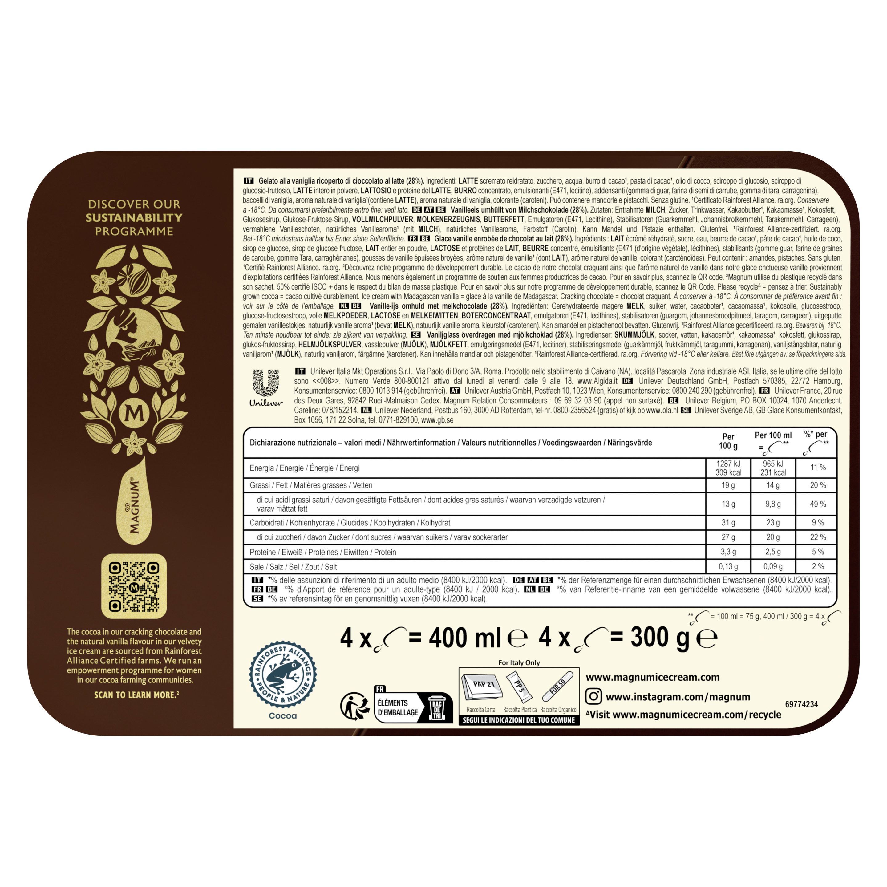Zutaten: Entrahmte MILCH, Zucker, Trinkwasser, Kokosfett, Kakaobutter¹, Kakaomasse¹, Glukose-Fruktose-Sirup, VOLLMILCHPULVER, Glukosesirup, MOLKENERZEUGNIS, BUTTERFETT, Emulgatoren (E471, Lecithine), Stabilisatoren (Guarkernmehl, Johannisbrotkernmehl, Tarakernmehl, Carrageen), vermahlene Vanilleschoten, natürliche Vanillearomen, Farbstoff (Carotin). Kann MANDEL, HASELNUSS, WALNUSS, CASHEWNUSS, PECANNUSS, PARANUSS, PISTAZIE, MACADAMIANUSS enthalten.¹Rainforest Alliance-zertifizierter Kakao wird während seiner Verarbeitung mit nicht zertifiziertem Kakao vermischt (Massenbilanz).