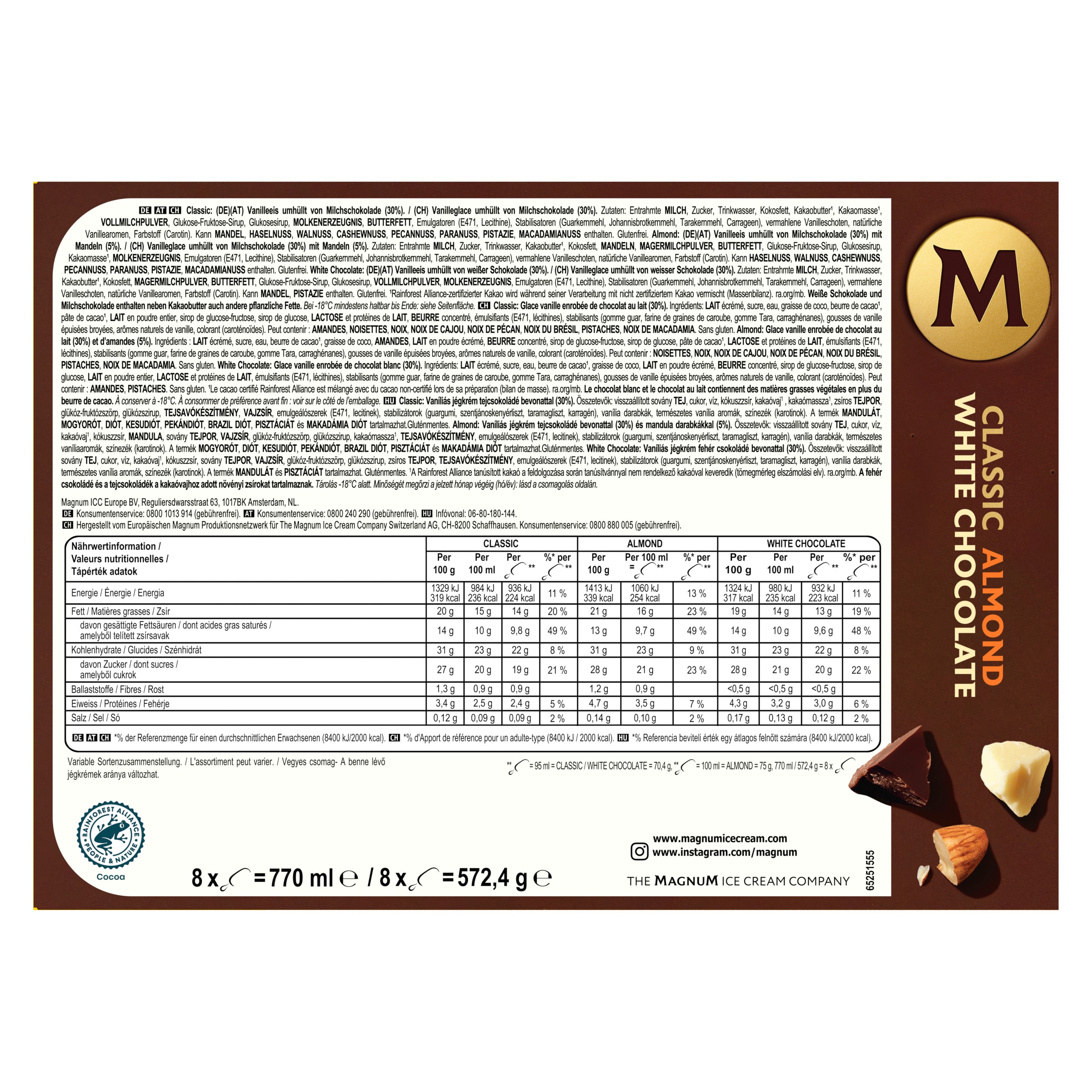 Zutaten: #Magnum CAW 6MP - White Chocolate Zutaten: Entrahmte MILCH, Zucker, Trinkwasser, Kakaobutter¹, Kokosfett, MAGERMILCHPULVER, BUTTERFETT, Glukose-Fruktose-Sirup, Glukosesirup, VOLLMILCHPULVER, MOLKENERZEUGNIS, Emulgatoren (E471, Lecithine), Stabilisatoren (Guarkernmehl, Johannisbrotkernmehl, Tarakernmehl, Carrageen), vermahlene Vanilleschoten, natürliche Vanillearomen, Farbstoff (Carotin). Kann MANDEL, PISTAZIE enthalten.¹Rainforest Alliance-zertifizierter Kakao wird während seiner Verarbeitung mit nicht zertifiziertem Kakao vermischt (Massenbilanz). #Magnum CAW 8MP - Almond Zutaten: Entrahmte MILCH, Zucker, Trinkwasser, Kakaobutter¹, Kokosfett, MANDELN, MAGERMILCHPULVER, BUTTERFETT, Glukose-Fruktose-Sirup, Glukosesirup, Kakaomasse¹, MOLKENERZEUGNIS, Emulgatoren (E471, Lecithine), Stabilisatoren (Guarkernmehl, Johannisbrotkernmehl, Tarakernmehl, Carrageen), vermahlene Vanilleschoten, natürliche Vanillearomen, Farbstoff (Carotin). Kann HASELNUSS, WALNUSS, CASHEWNUSS, PECANNUSS, PARANUSS, PISTAZIE, MACADAMIANUSS enthalten.¹Rainforest Alliance-zertifizierter Kakao wird während seiner Verarbeitung mit nicht zertifiziertem Kakao vermischt (Massenbilanz). #Magnum CAW 8MP - Classic Zutaten: Entrahmte MILCH, Zucker, Trinkwasser, Kokosfett, Kakaobutter¹, Kakaomasse¹, VOLLMILCHPULVER, Glukose-Fruktose-Sirup, Glukosesirup, MOLKENERZEUGNIS, BUTTERFETT, Emulgatoren (E471, Lecithine), Stabilisatoren (Guarkernmehl, Johannisbrotkernmehl, Tarakernmehl, Carrageen), vermahlene Vanilleschoten, natürliche Vanillearomen, Farbstoff (Carotin). Kann MANDEL, HASELNUSS, WALNUSS, CASHEWNUSS, PECANNUSS, PARANUSS, PISTAZIE, MACADAMIANUSS enthalten.¹Rainforest Alliance-zertifizierter Kakao wird während seiner Verarbeitung mit nicht zertifiziertem Kakao vermischt (Massenbilanz).