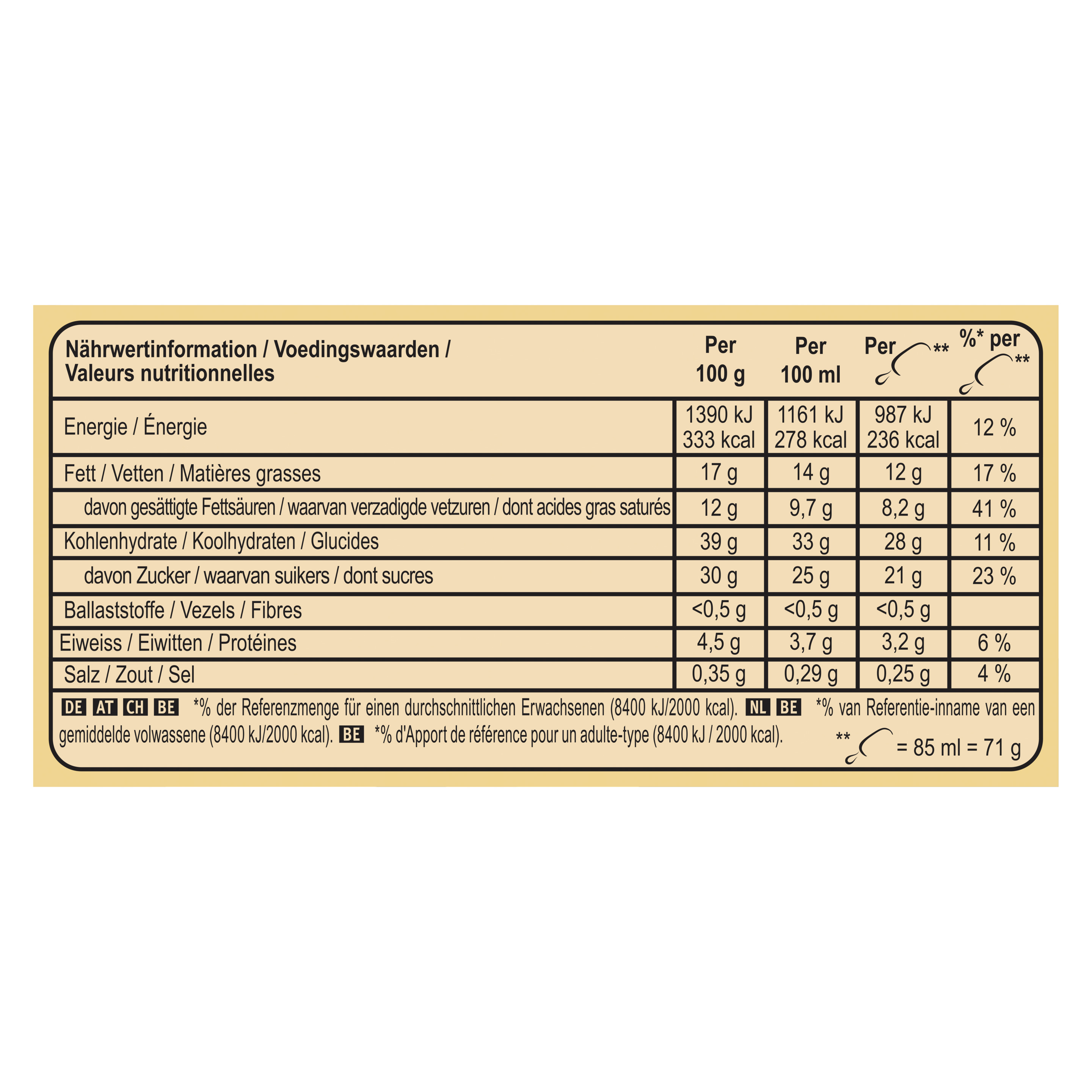 Zutaten: Entrahmte MILCH, Zucker, Glukosesirup, MAGERMILCHPULVER, Kakaobutter¹, BUTTERFETT, Glukose-Fruktose-Sirup, Kokosfett, Fruktose, Stärke, MOLKENERZEUGNIS, Karamellzuckersirup, Reismehl, Emulgatoren (E471, E476, Lecithine), Stabilisatoren (E407, E410, E417, E412), Speisesalz (0,1%), Aromen, Sonnenblumenöl, Kakaomasse¹, BUTTER, MAGERMILCH-Pulver oder -Konzentrat, Backtriebmittel (E500). Kann SOJA, MANDEL, HASELNUSS, WALNUSS, CASHEWNUSS, PECANNUSS, PARANUSS, PISTAZIE und MACADAMIANUSS enthalten.¹Rainforest Alliance-zertifiziert.
