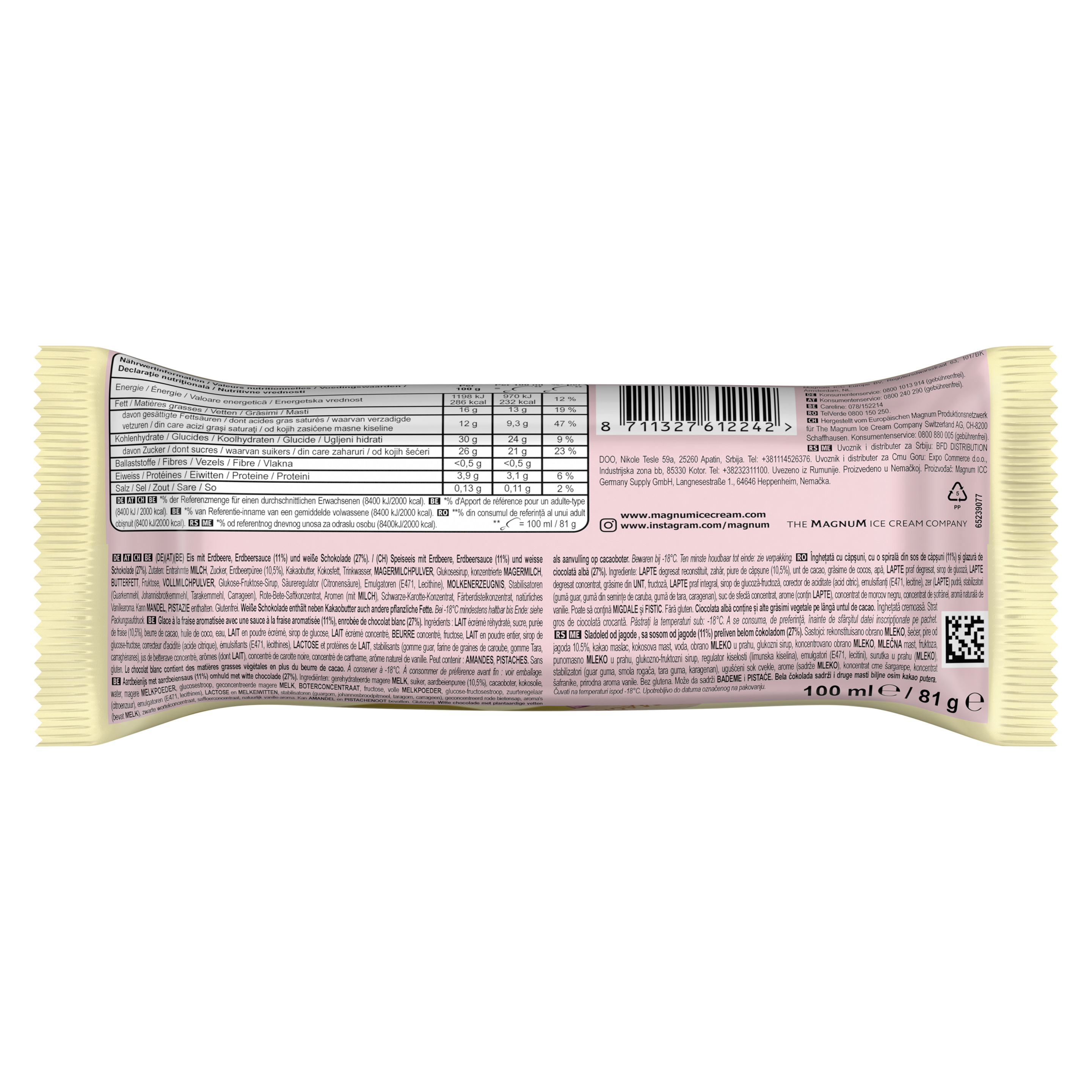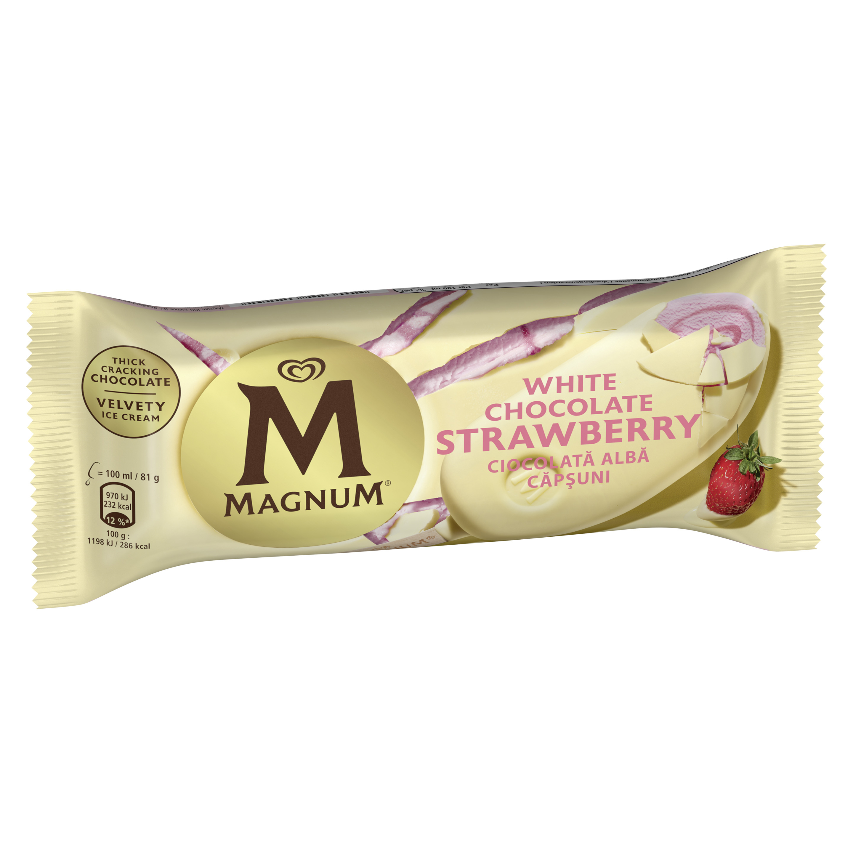 Magnum White Chocolate Strawberry ist fruchtiges Eis mit Erdbeeren, durchzogen von feiner Erdbeersauce und umhüllt von weißer Magnum Schokolade. Die perfekte Balance aus knackiger Schokolade und erfrischendem Fruchteis. Magnum – lebe deinen genuss. Aufregend anders und unverschämt köstlich – so eroberte Magnum im Sommer 1990 als erstes Eis speziell für Erwachsene den Eismarkt in Österreich. Heute ist Magnum mit weltweit mehr als 2 Milliarden verkauften Eis pro Jahr eine der international führenden Eismarken und die größte Eismarke von Unilever. Egal ob klassisches Vanilleeis in einer Milchschokoladenhülle, Fruchteis, Schokoladeneis, veganes Eis, als Mini Eis oder Becher Eis, die verführerische Welt von Magnum bietet in seinem Sortiment Eis in verschiedensten Variationen und Formaten für noch mehr Vergnügen und für die unterschiedlichsten Anlässe.