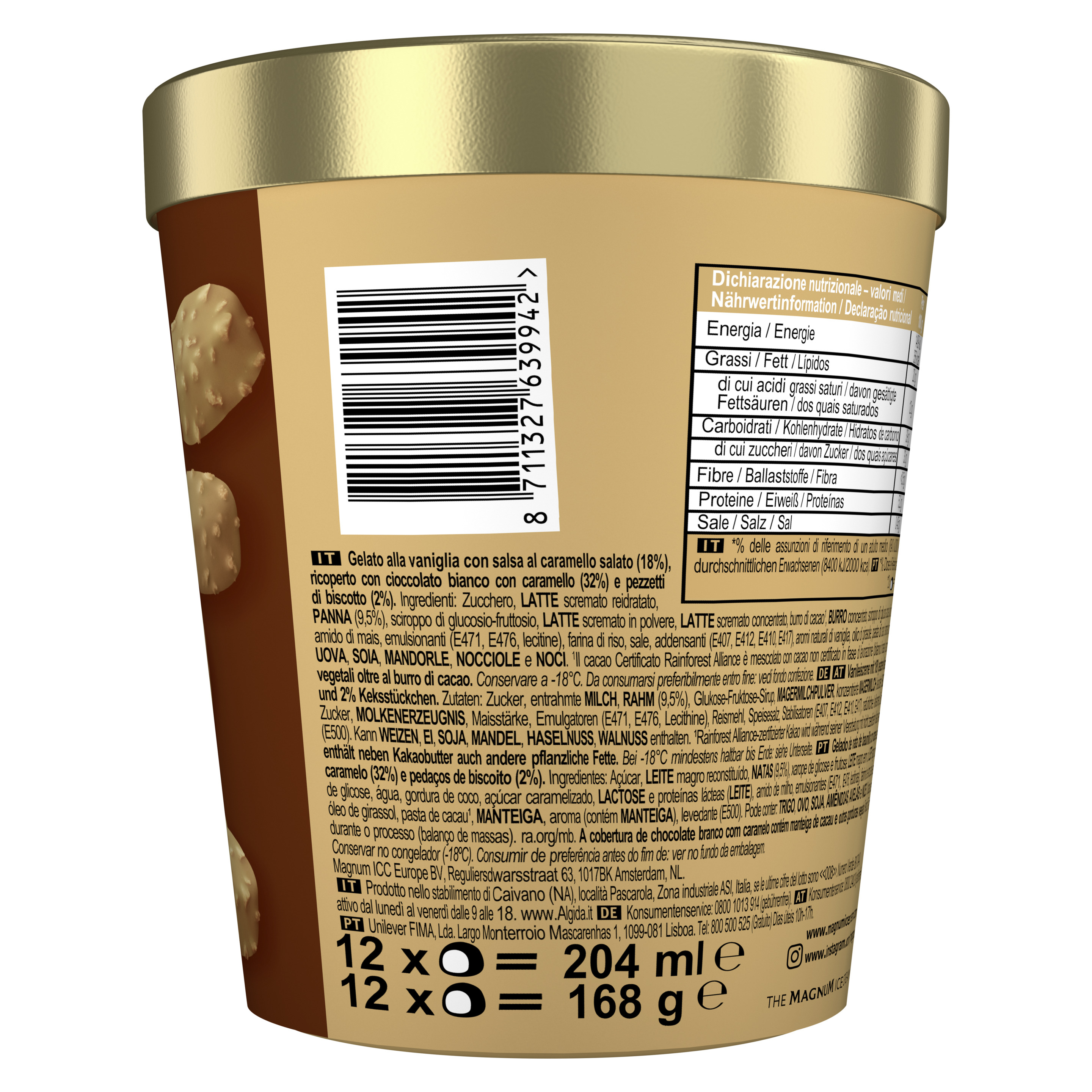 Viele kleine Genussmomente vereint in einem Becher. Die feinen Eispralinen Magnum Bonbon Gold Caramel Billionaire (12 x 17 ml) vereinen feine Vanilleeiscreme mit einer leicht gesalzenen Karamellsauce, umhüllt von karamell-goldfarbener Schokolade und knusprigen Keksstückchen. Einfach Magnum – einfach köstlich Die 12 leckeren Magnum Bonbon Gold Caramel Billionaire Eispralinen im praktischen Becher sind ein perfekter Snack für eine Auszeit sowie zum Teilen und sorgen für leckeren Eiscreme Genuss. Die perfekte Balance aus knackiger weißer Schokolade und cremigem Eis.