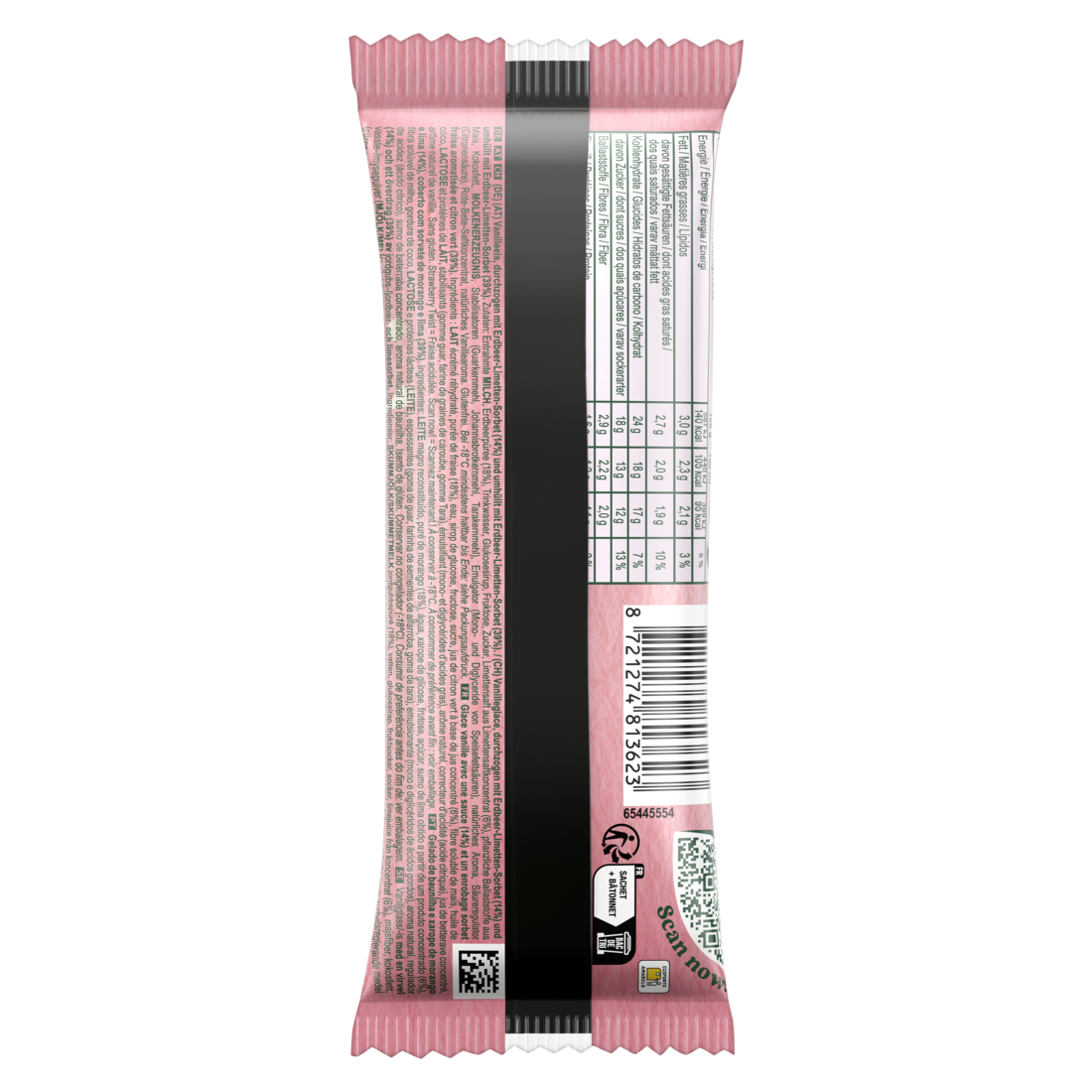 Zutaten: Entrahmte MILCH, Erdbeerpüree (18%), Trinkwasser, Glukosesirup, Fruktose, Zucker, Limettensaft aus Limettensaftkonzentrat (6%), pflanzliche Ballaststoffe aus Mais, Kokosfett, MOLKENERZEUGNIS, Stabilisatoren (Guarkernmehl, Johannisbrotkernmehl, Tarakernmehl), Emulgator (Mono- und Diglyceride von Speisefettsäuren), natürliches Aroma, Säureregulator (Citronensäure), Rote-Bete-Saftkonzentrat, natürliches Vanillearoma.